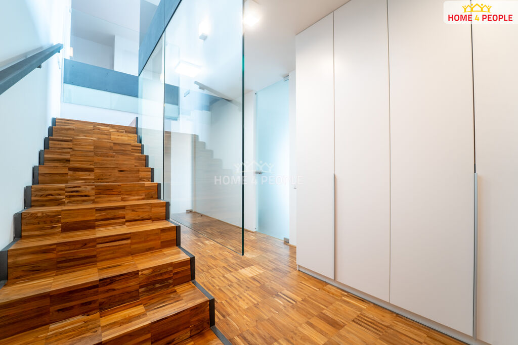 - Designové prvky ze skla a hliníkové zábradlí na schodišti