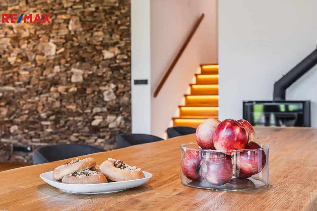 Přízemí: velkorysý prosklený obývací pokoj, koupelna, zádveří, technická místnost, zahradní sklad, vedlejší víceúčelový domek (lze vybudovat wellness nebo samostatný apartmán).