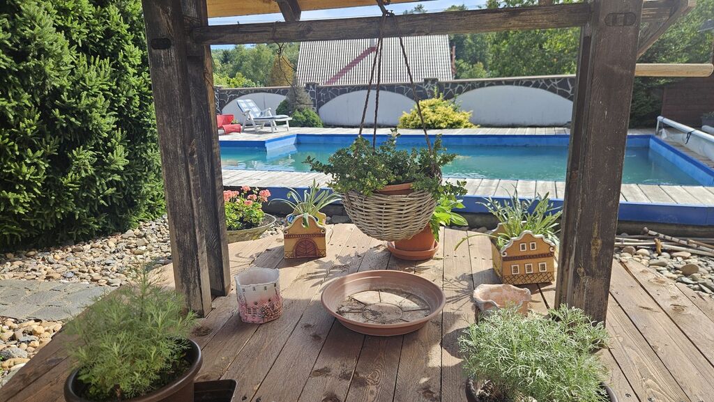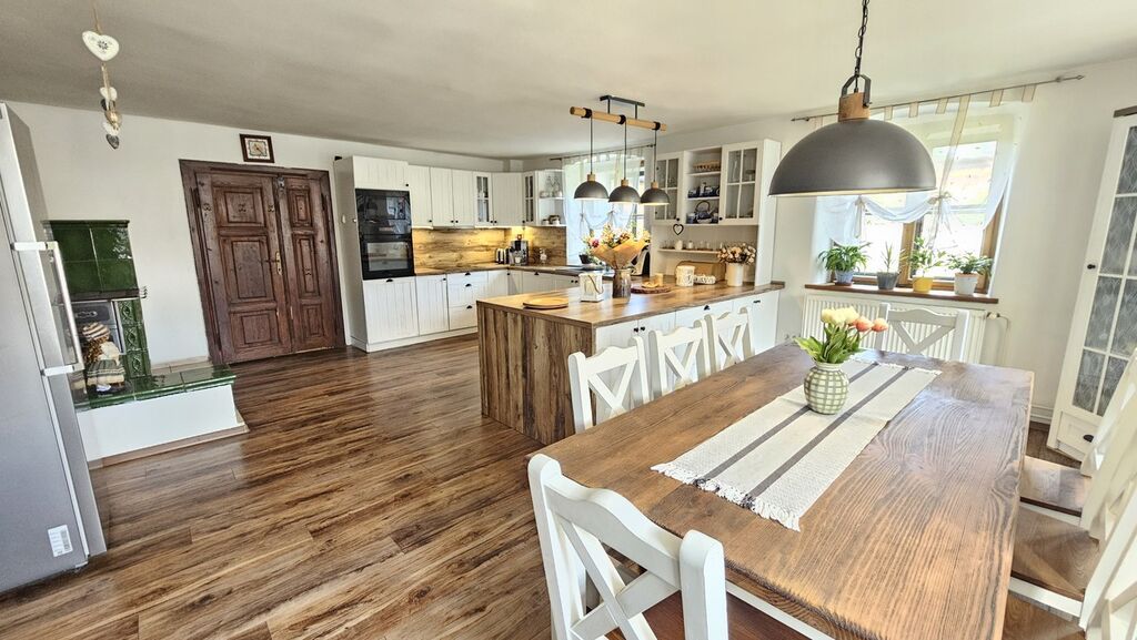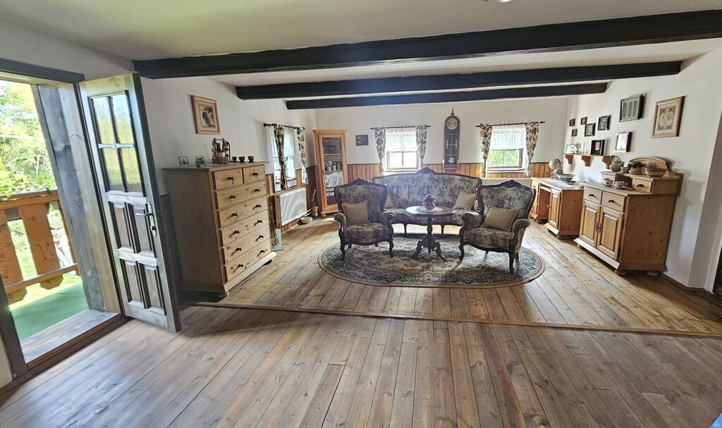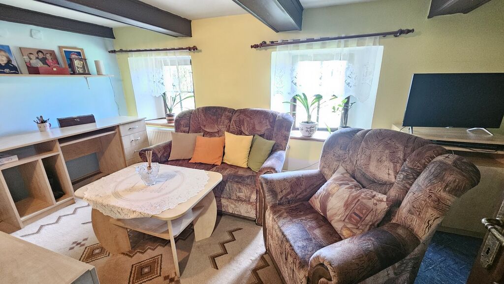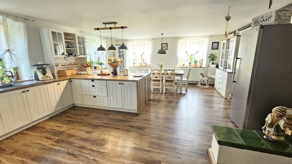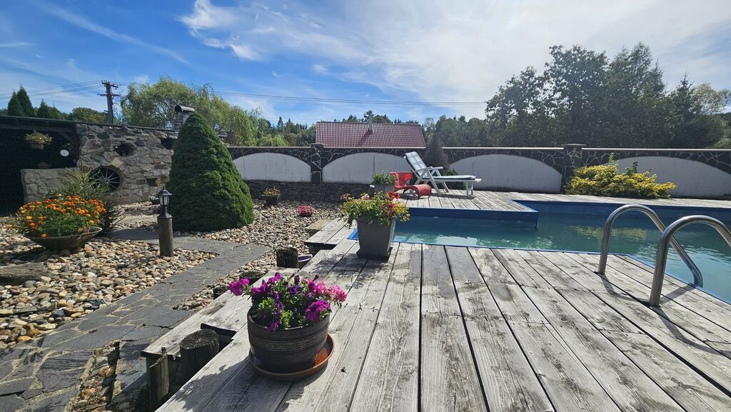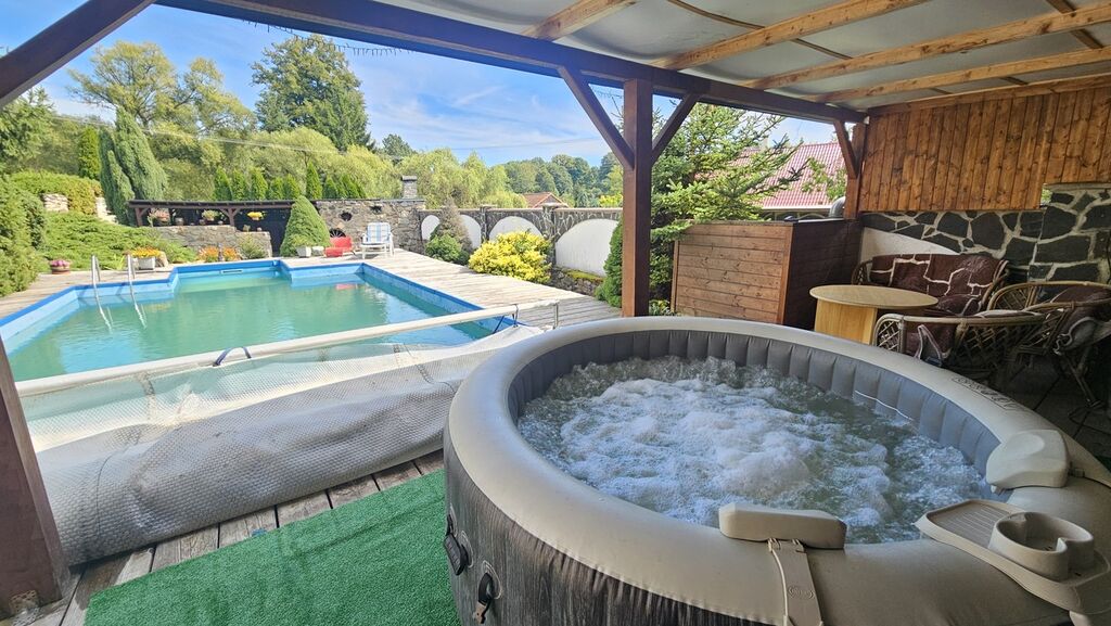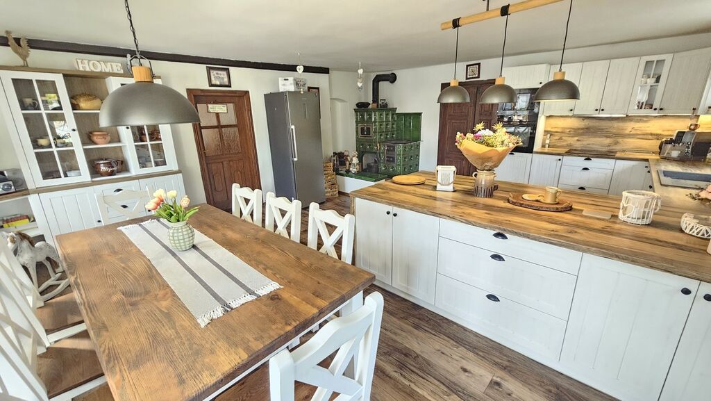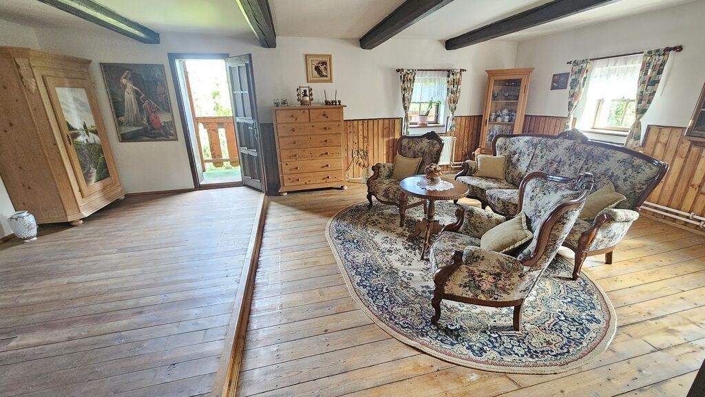Dominantou je prostorná chalupa po rekonstrukci, která kombinuje útulnou atmosféru s velkým množstvím obytných i společenských místností. Najdete zde kuchyň s krásnými kachlovými kamny, kde se setkáváte s rodinou a přáteli, společenská místnost s barem, krbem a biliárovým stolem pro večerní zábavu i několik dalších pokojů a odpočinkových zákoutí pro hosty. V patře čeká zastřešený balkon s výhledem před chalupu a na okolí domu. V podkroví vás čekají další dva obytné prostory, které působí opravdu útulně.
