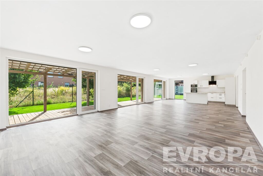 o velkorysý obývací pokoj s kuchyňským koutem (83,74 m²) a pěti výstupy na zahradu a zastřešenou terasu