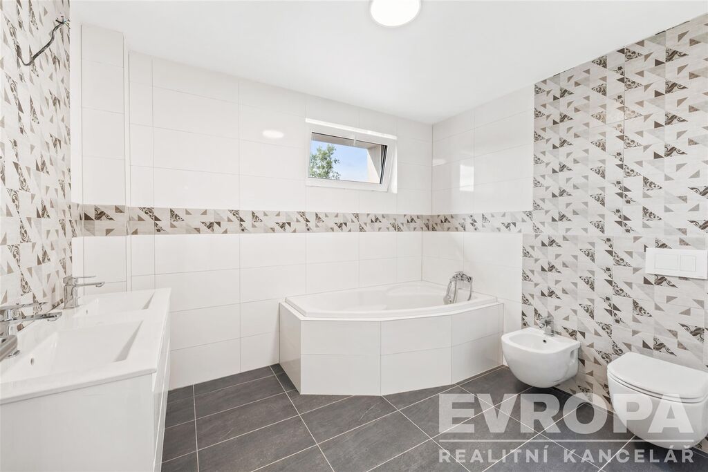 o koupelna s vanou, WC, bidetem a dvěma umyvadly