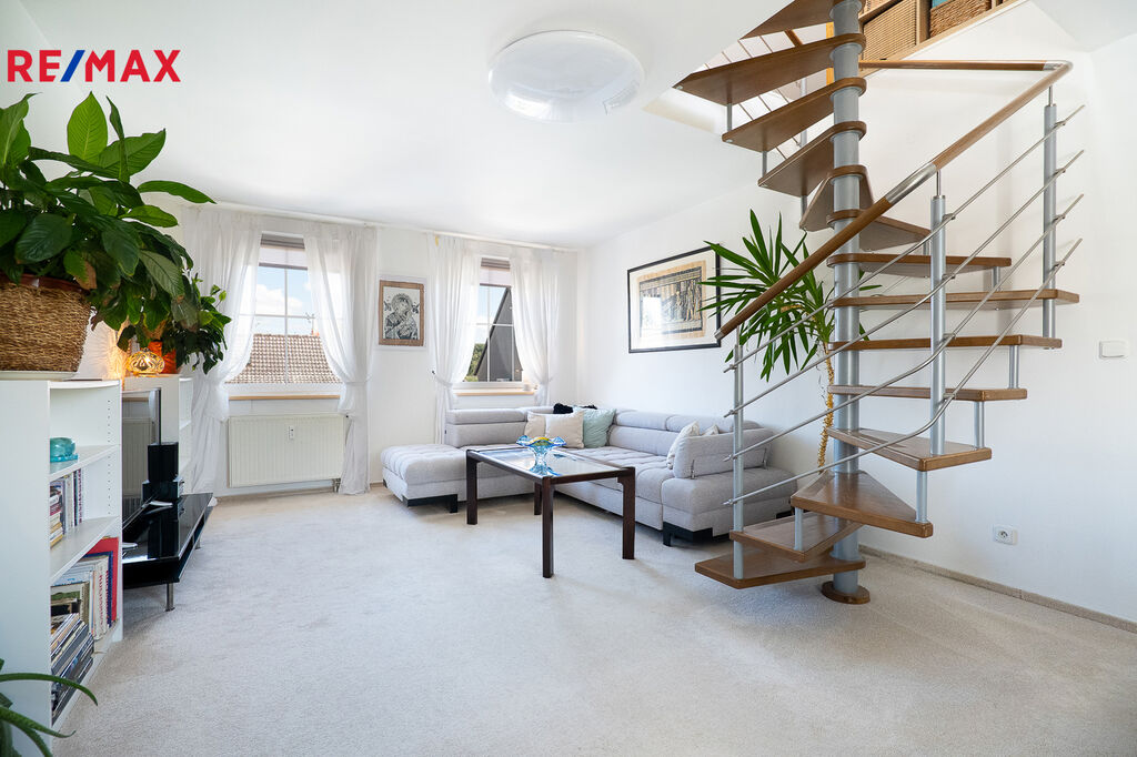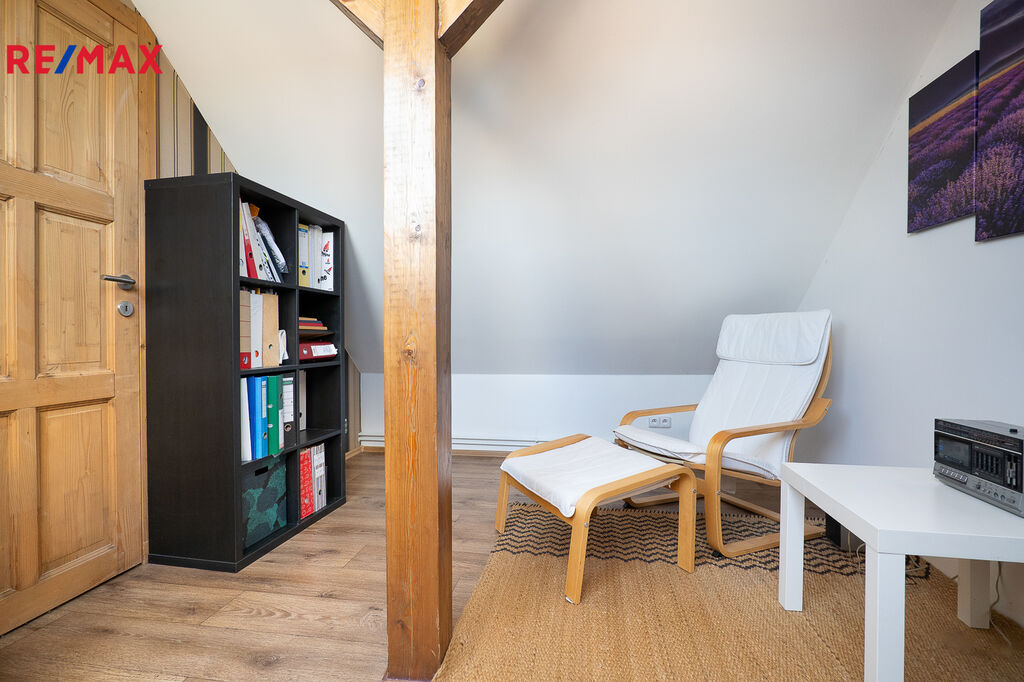 Dřevěné točité schodiště z masivního buku vede do podkroví, kde se nachází dvě ložnice, aktuálně využívané jako pracovna majitelky. Je zde možnost instalace druhé koupelny.  Celková podlahová plocha podkroví je 39,7 m².