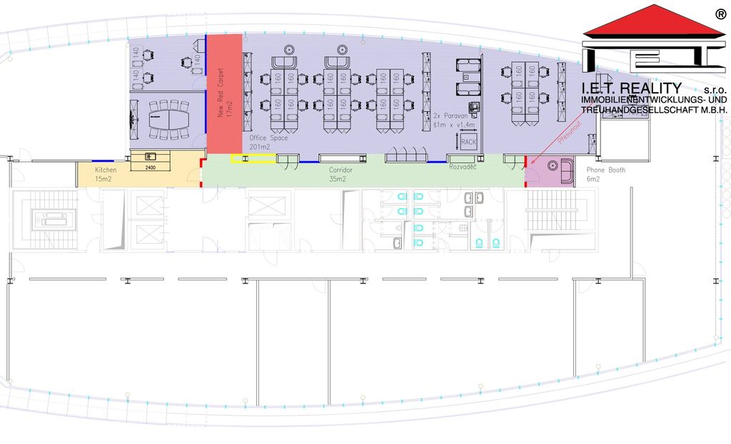 Kancelář se dispozičně skládá z 2 větších místnosti formou open office o výměře 201 m2 a uzavřené zasedací místnosti a menší kanceláře, dále pak z chodby a vlastní oddělené kuchyňky přímo pro tyto prostory. Prostory mají vlastní toalety, dámské i pánské. Prostory jsou připravené rovnou k nastěhování a jsou plně vybaveny. Poplatky za užívání kanceláří jsou 160 Kč/m2/měsíc, patří do nich i poplatky za spotřebu elektřiny.