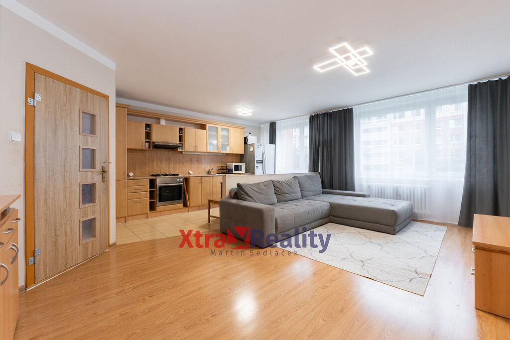 Byt prošel v minulosti kompletní rekonstrukcí včetně zrušení příčky mezi obývacím pokojem a kuchyní, což dodává bytu vzdušnost.