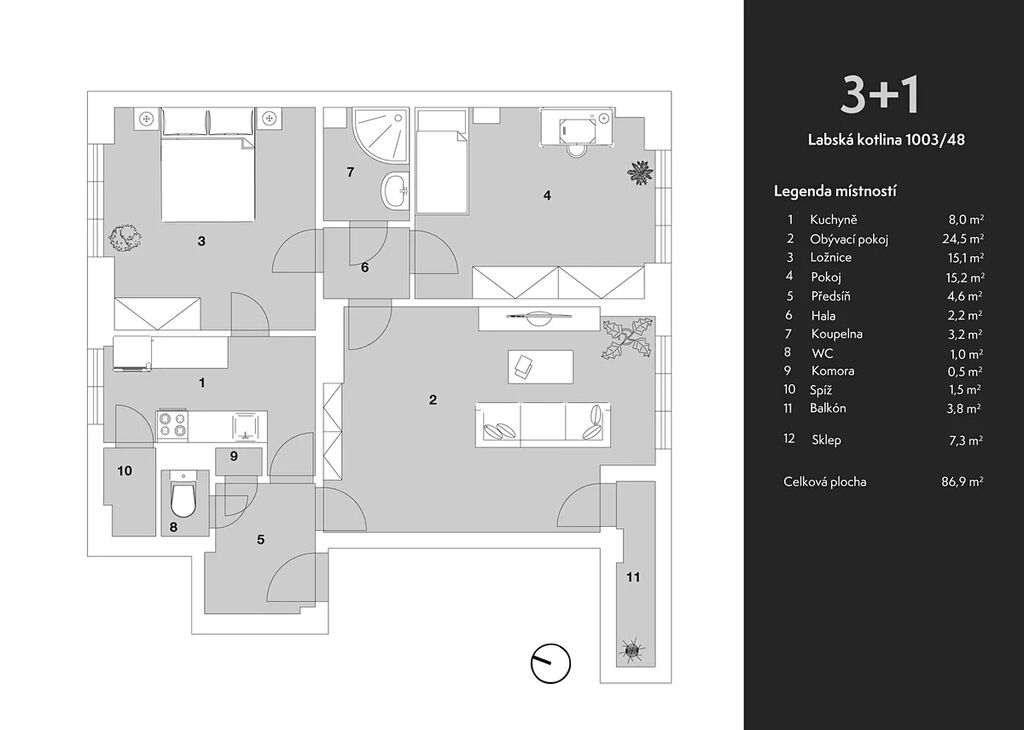* Celková plocha bytu vč. příslušenství je 87 m2