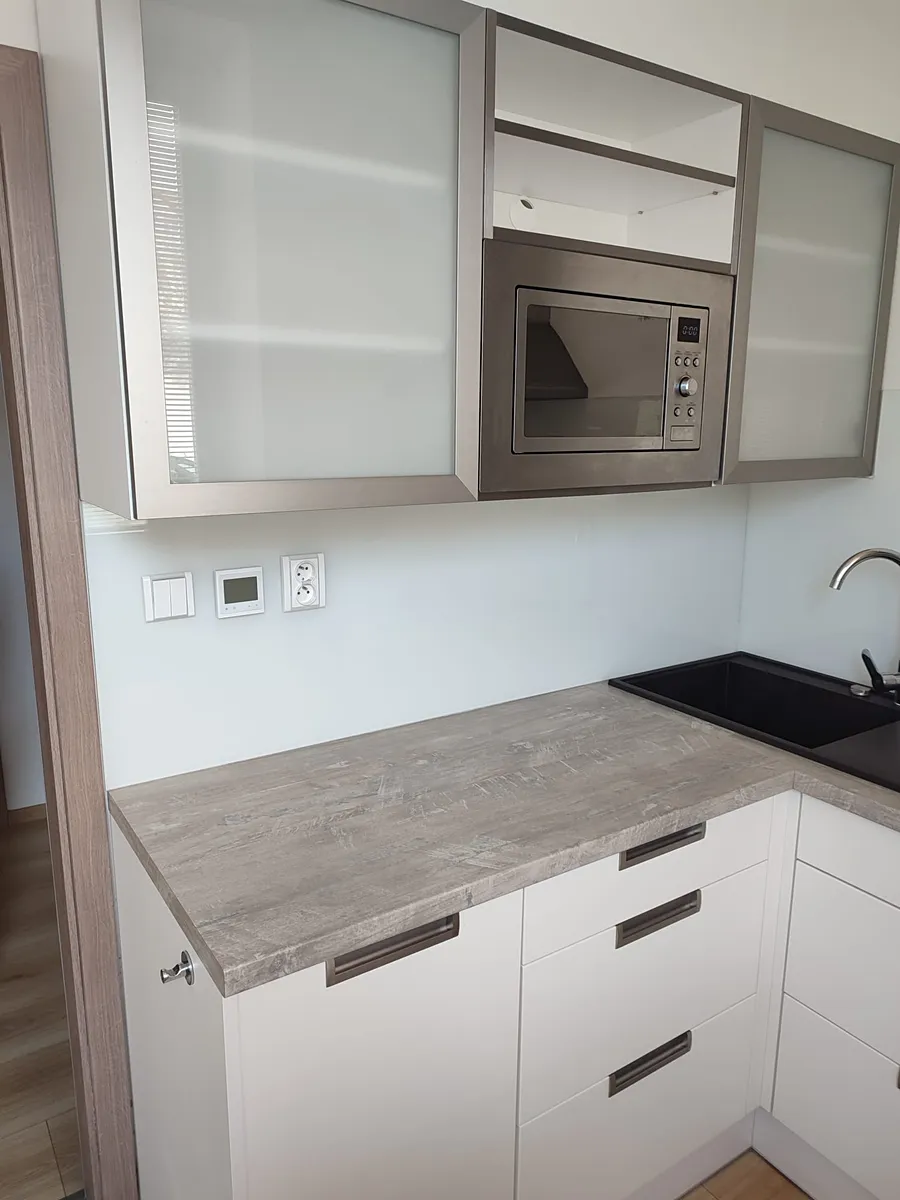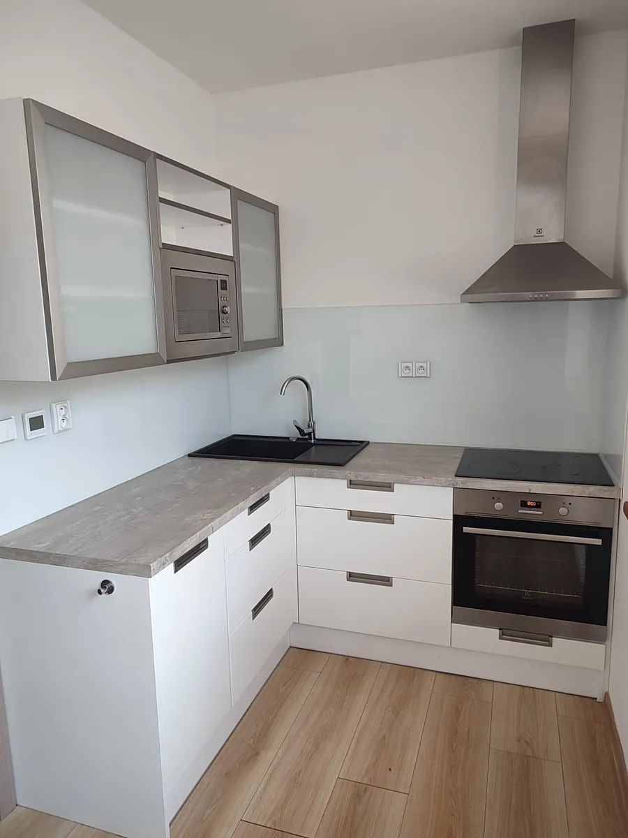 sklokeramická deska,trouba,digestoř,myčka,mikrovlnná trouba). Pokoje jsou neprůchozí, což umožnuje dostatek soukromí. Z obývacího pokoje vstupujete do obou oddělených menších ložnic. Koupelna je vybavena vanou a umyvadlem, WC je samostatné včetně umyvadla. Součástí bytu je intercom. V bytě je položena plovoucí podlaha, v koupelně keramická dlažba. Celá jednotka je vytápěna podlahovým topením (úsporné elektrické infra fólie). Celý bytový dům je oplocený.