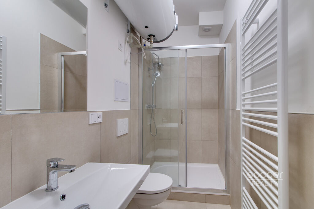 Po vstupu do bytu vejdete do prostorné předsíně, která je ihned spojená s kuchyňským koutem, kde se nachází kompletně vybavená kuchyňská linka se všemi spotřebiči včetně pračky a myčky. Koupelna je se sprchovým koutem a WC.