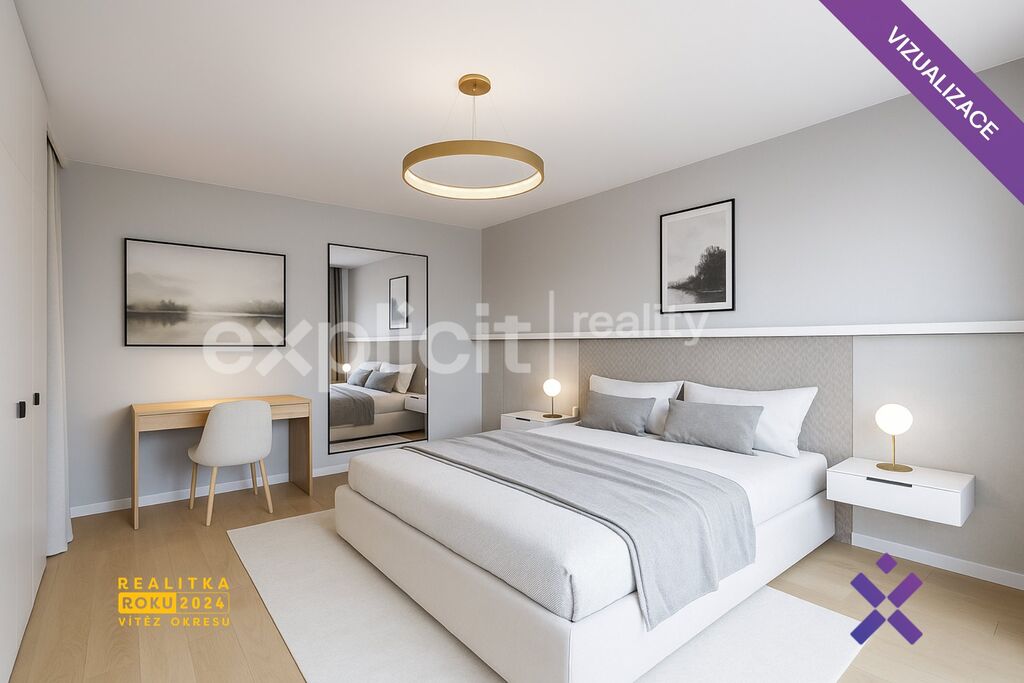 V patře jsou další dva pokoje a kuchyň. Prostor pro rodinu s dospělými dětmi, hosty nebo pro vybudování samostatné bytové jednotky. Jeden z pokojů má balkon, z chodby je vstup na zastřešenou terasu s výhledem do zahrady.