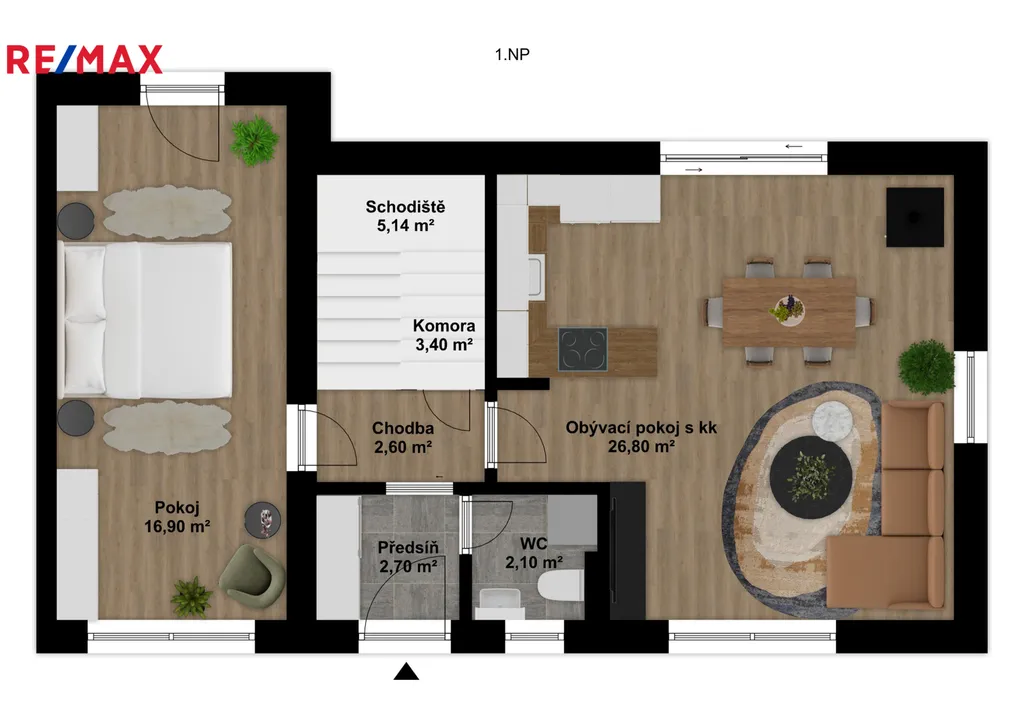 1NP: předsíň 2,7 m2, samostatné WC 2,1 m2, komora pod schody 3,4 m2, obývací pokoj , s kuchyňským koutem ( vybavený kuchyňskou linkou na míru, včetně kompletních spotřebičů ), krbem a vstupem na terasu 27 m2, pokoj 17 m2, se vstupem na zastřešenou terasu o výměře 42 m2 ( lze z ní vytvořit další pokoj o výměře cca 30 m2 ), chodba 2,6 m2, dřevěné schodiště do horního patra 2,6 m2.