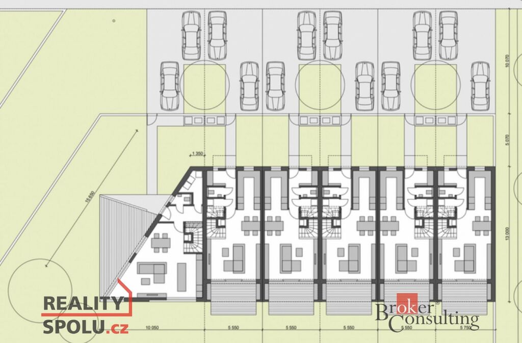Projekt: schválená výstavba 3 řadových dvojdomů (celkem 6 rodinných domů, každý se samostatným vstupem).