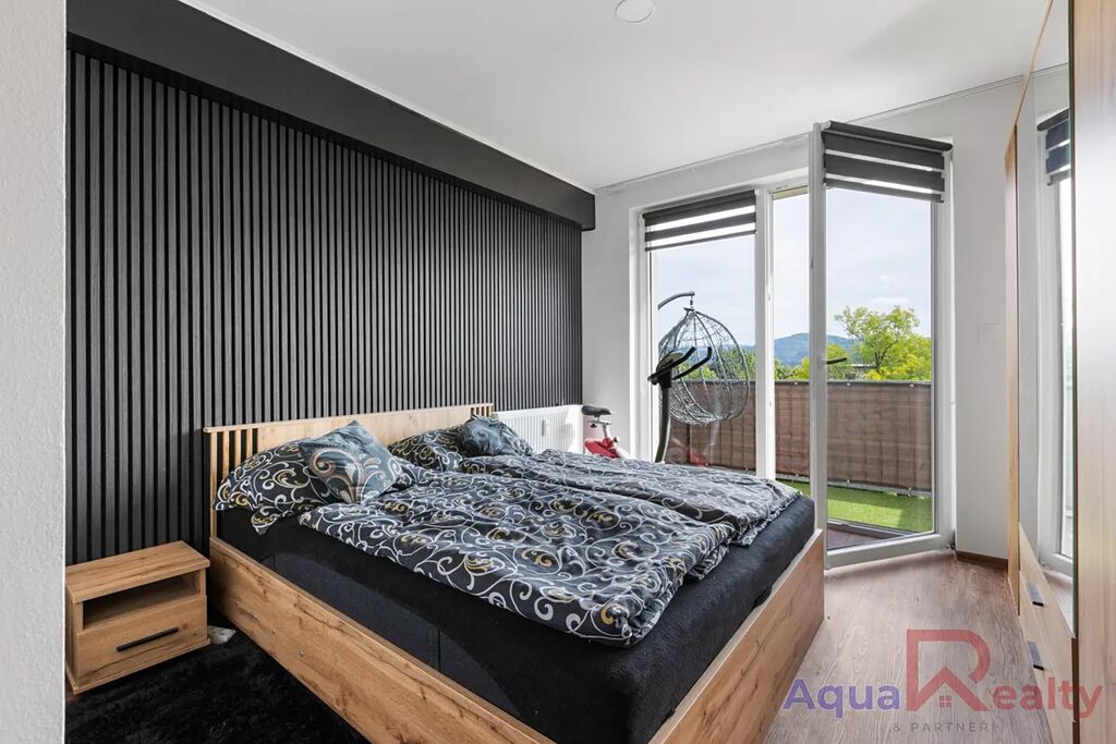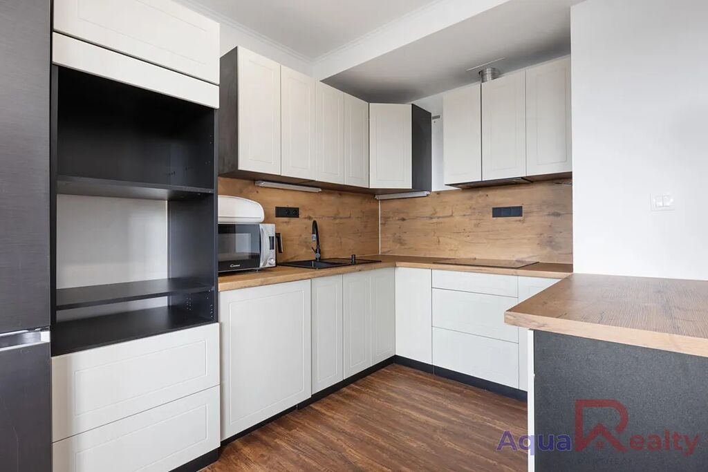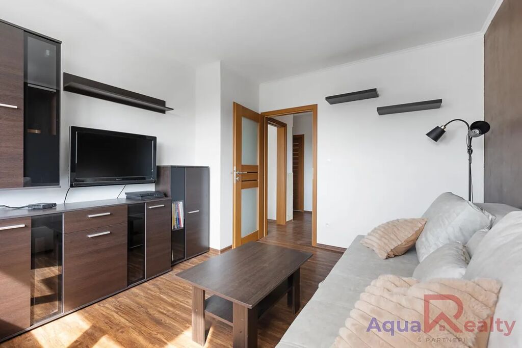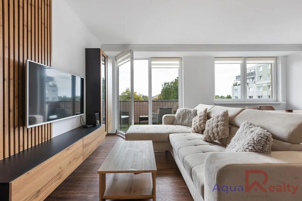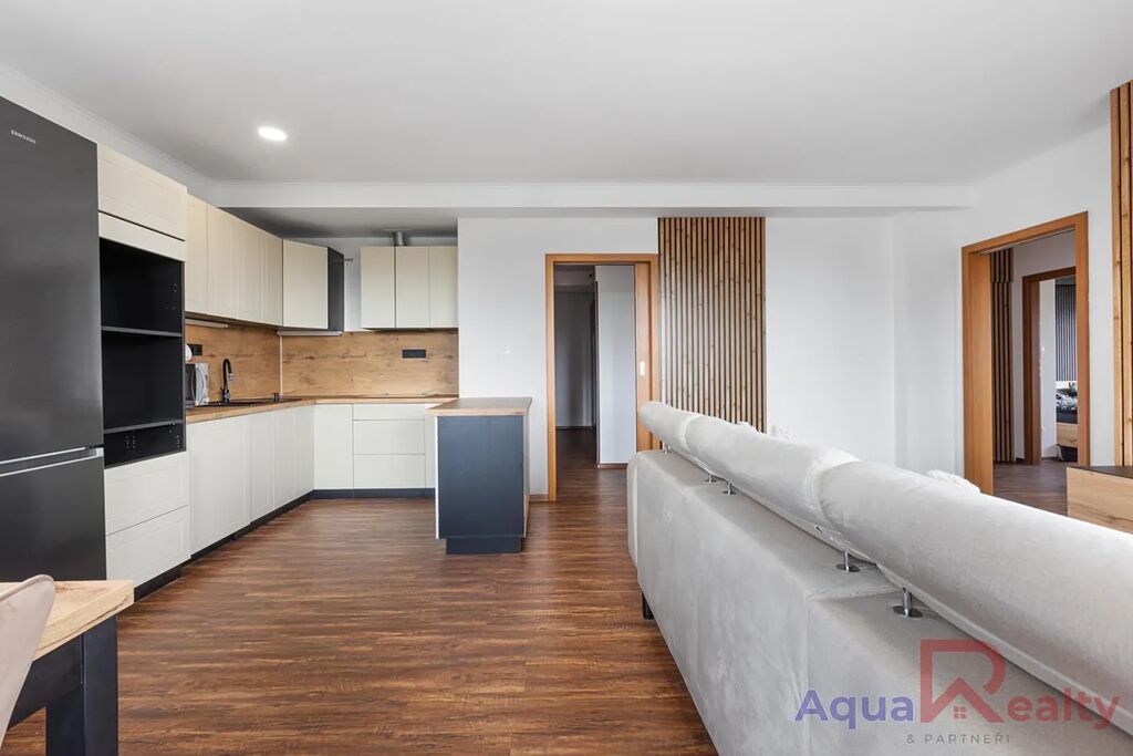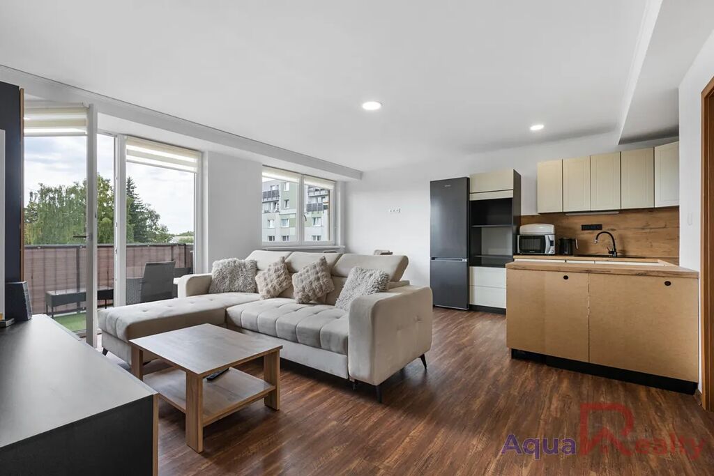 Obývací pokoj je propojený s kuchyňským koutem, který tvoří srdce celého bytu. Kuchyňská linka je vybavena velkou lednicí s mrazákem značky Samsung, mikrovlnnou troubou a moderní indukční varnou deskou bez elektrické trouby. Celý prostor působí svěže a vzdušně a z obývací části je vstup na balkon, ideální pro ranní kávu nebo večerní odpočinek.