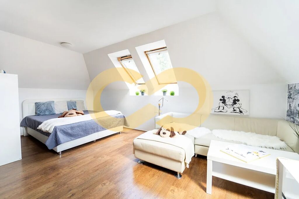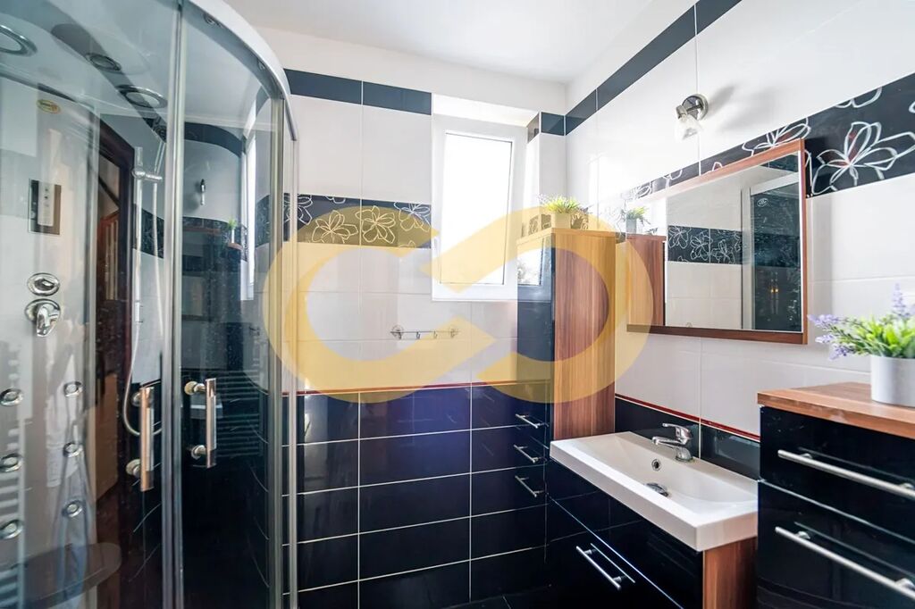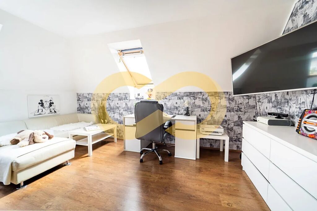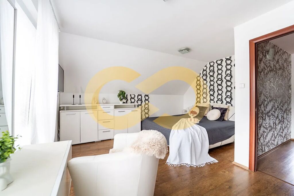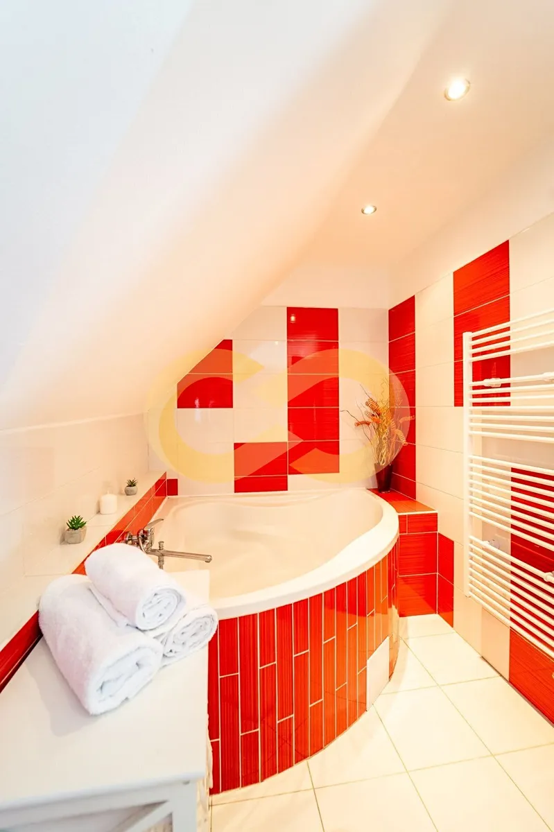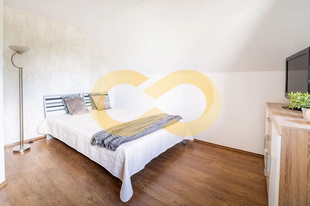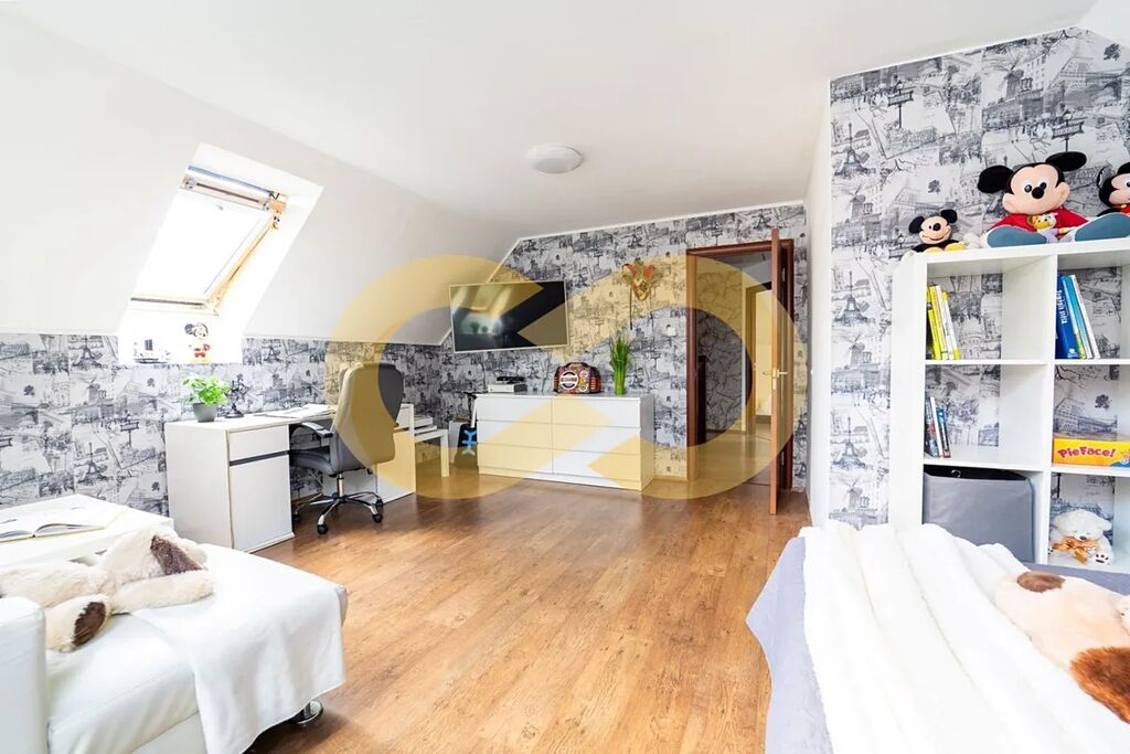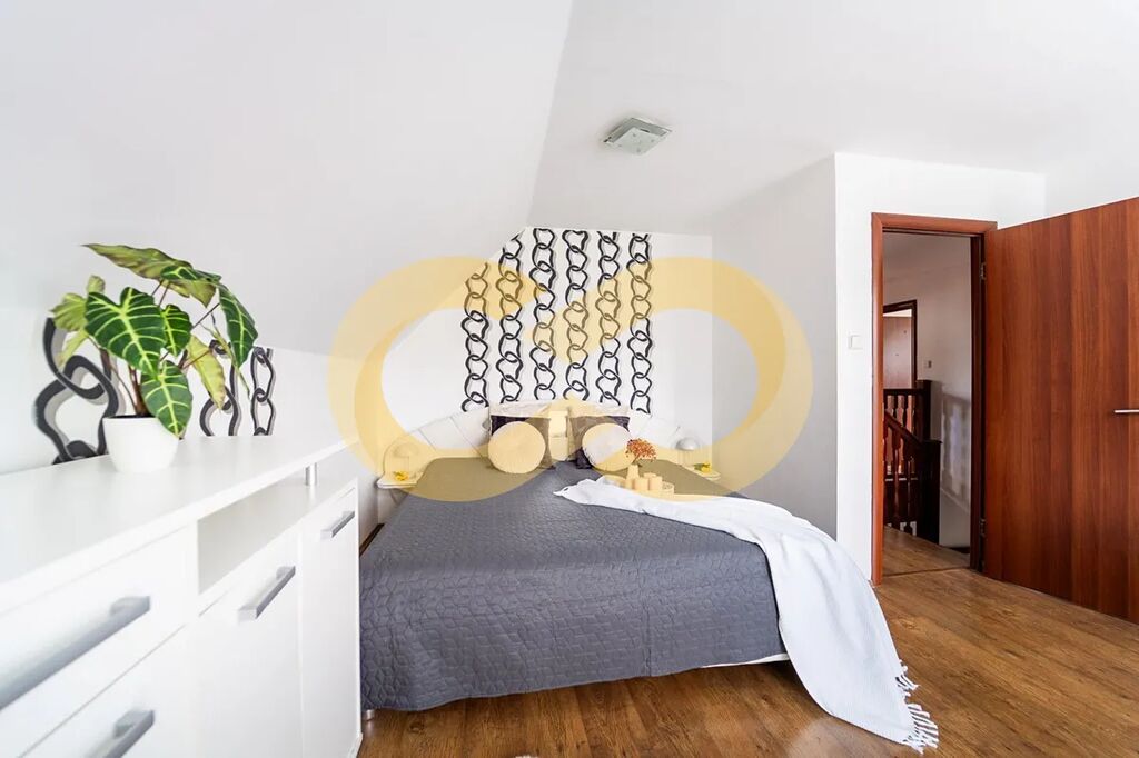 V patře je ložnice se šatnou a velkými francouzskými okny, přes chodbu je velký dětský pokoj a ještě jedna ložnice. Na patře je koupelna s rohovou vanou a WC.