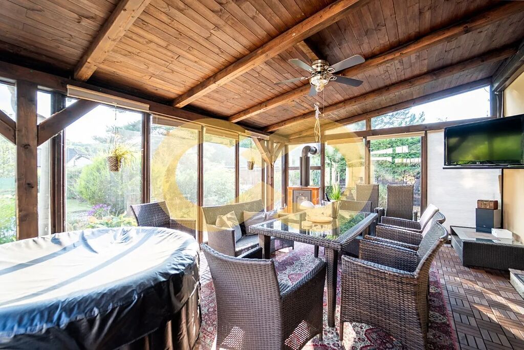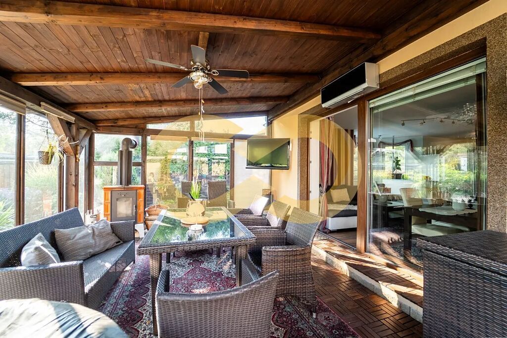 Stačí otevřít portál a vstoupit do celoroční oázy klidu a pohody. Zimní zahrada má krb i klimatizaci – v létě se tu neupečete a v zimě vám romantiku ve vířivce dokreslí praskot dřeva.