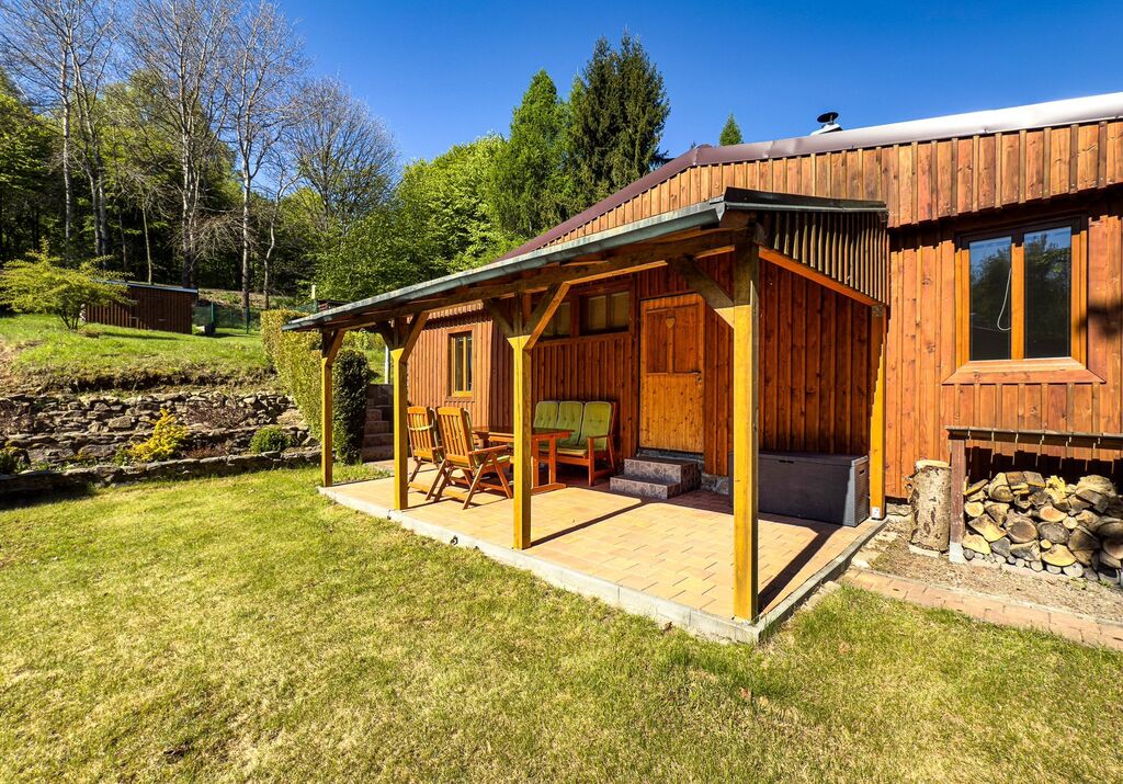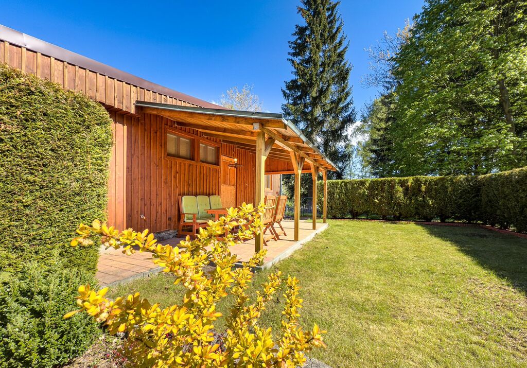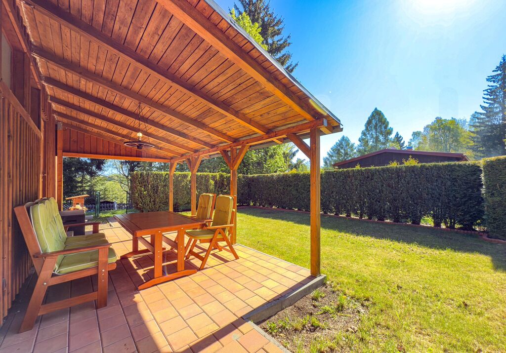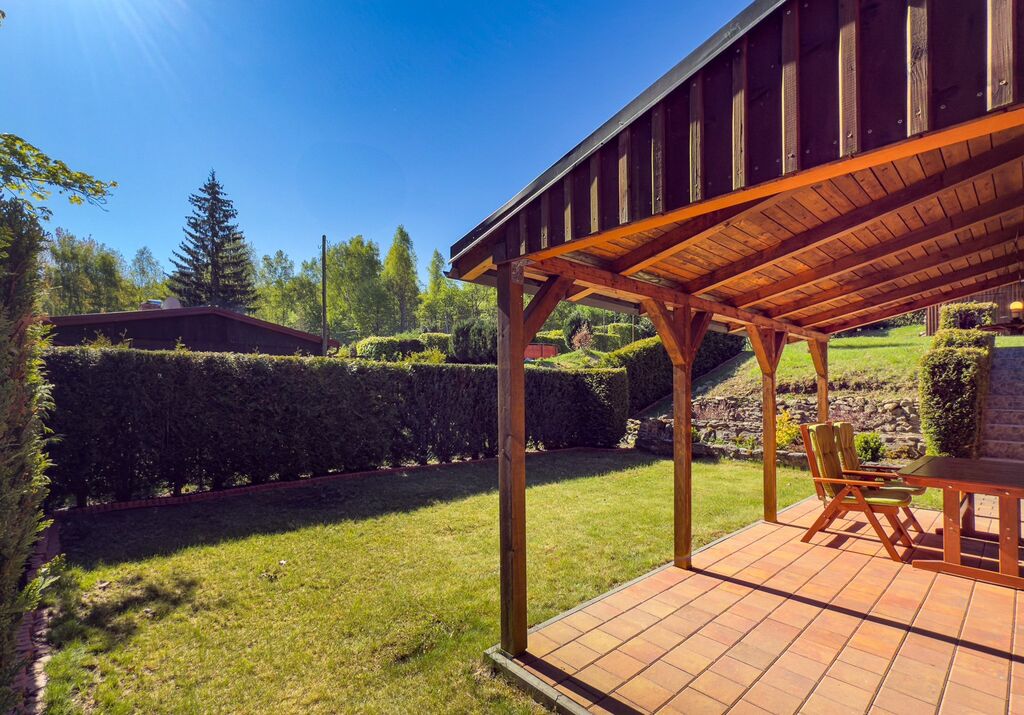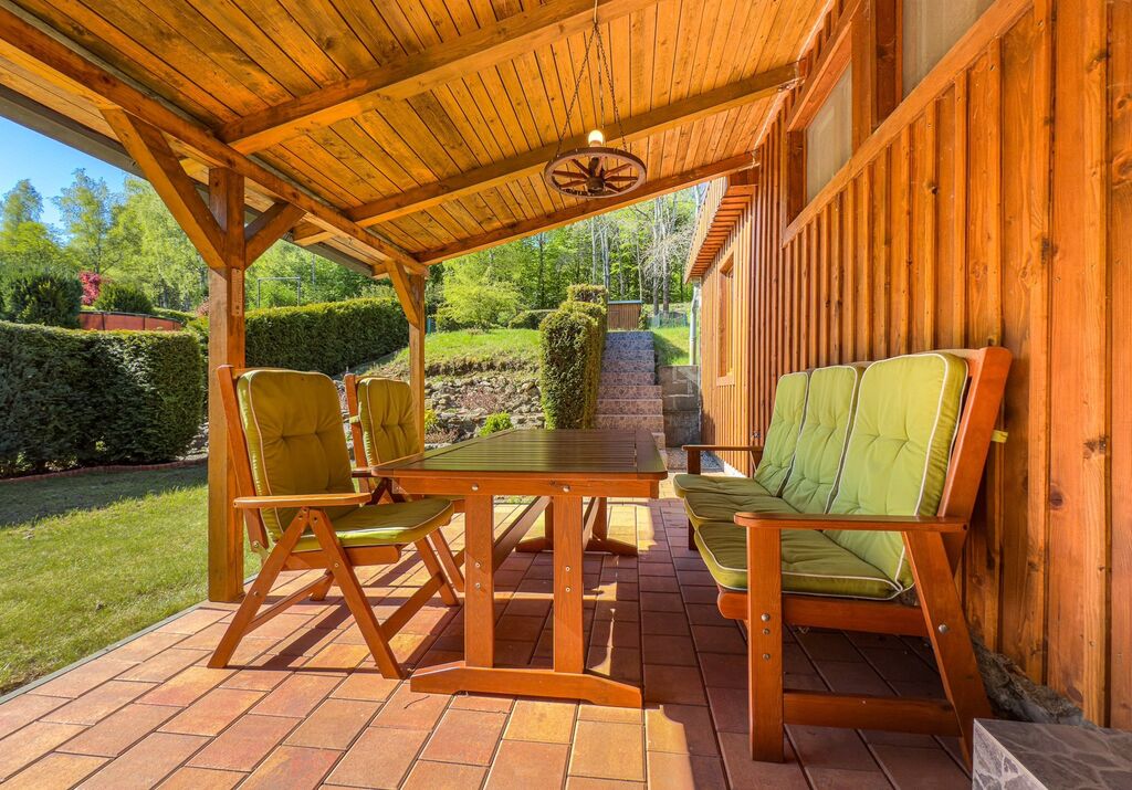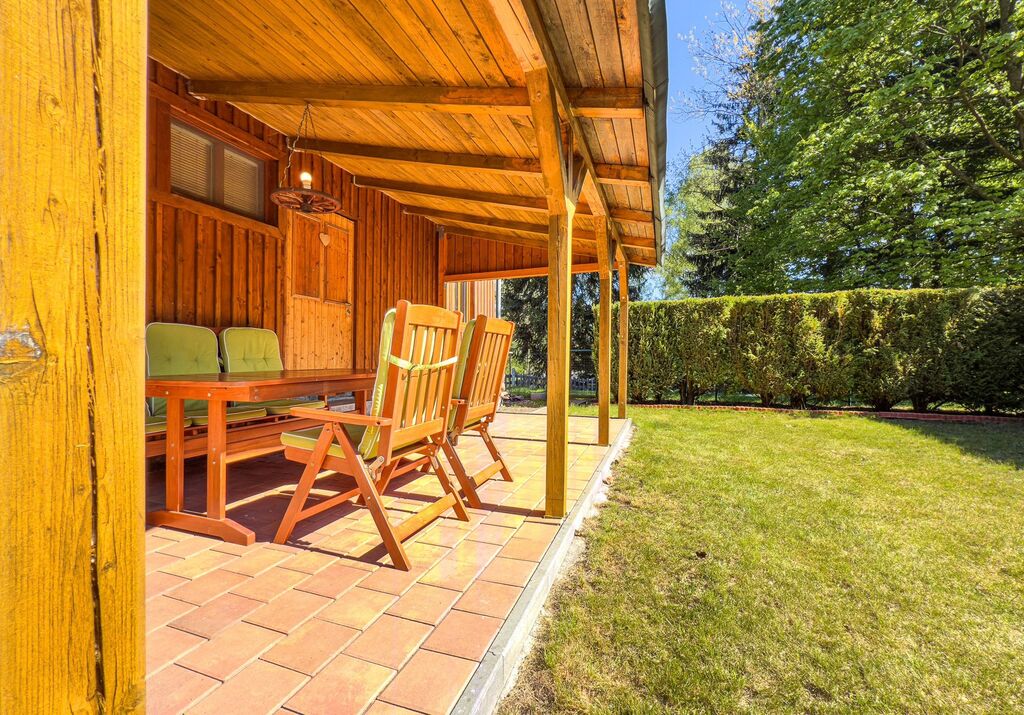 K chatě náleží zastřešená pergola s posezením, dva dřevníky a vlastní parkovací stání. Další automobil lze zaparkovat i na oploceném pozemku.