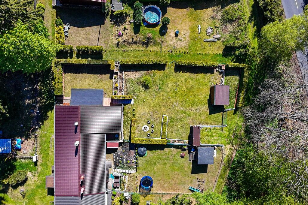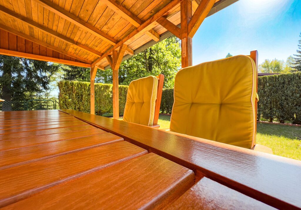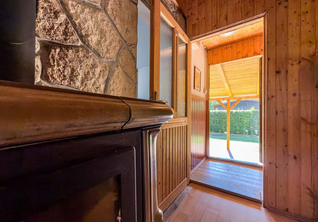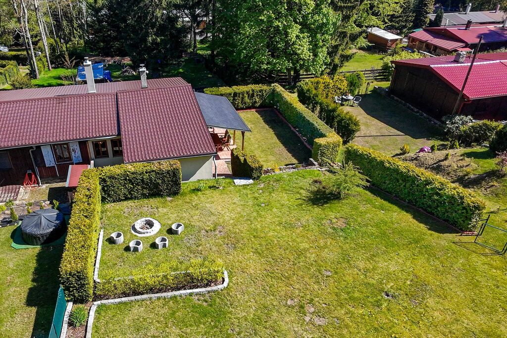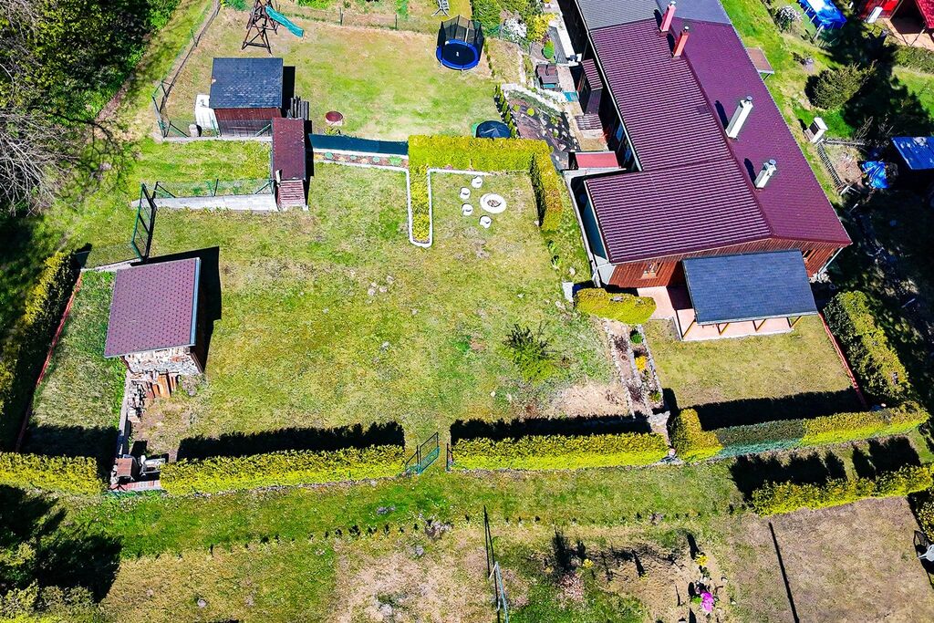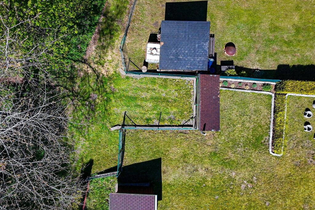 K chatě náleží zastřešená pergola s posezením, dva dřevníky a vlastní parkovací stání. Další automobil lze zaparkovat i na oploceném pozemku.
