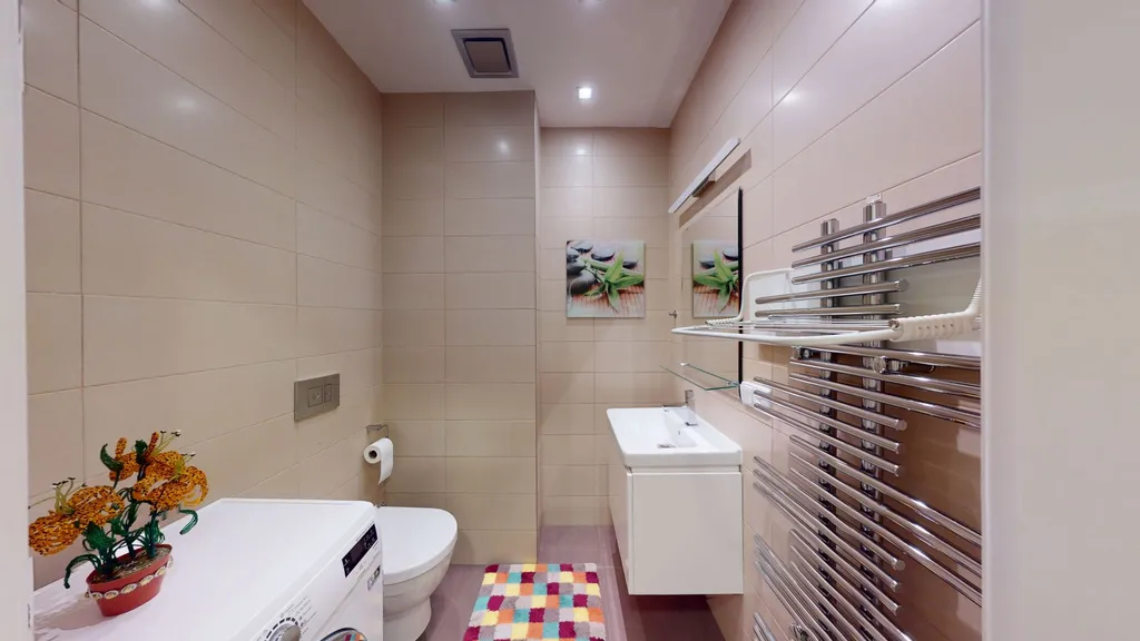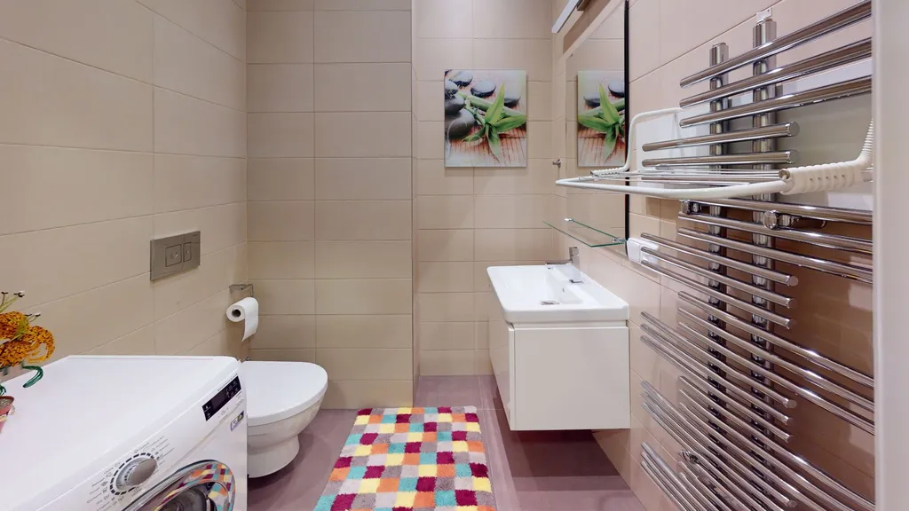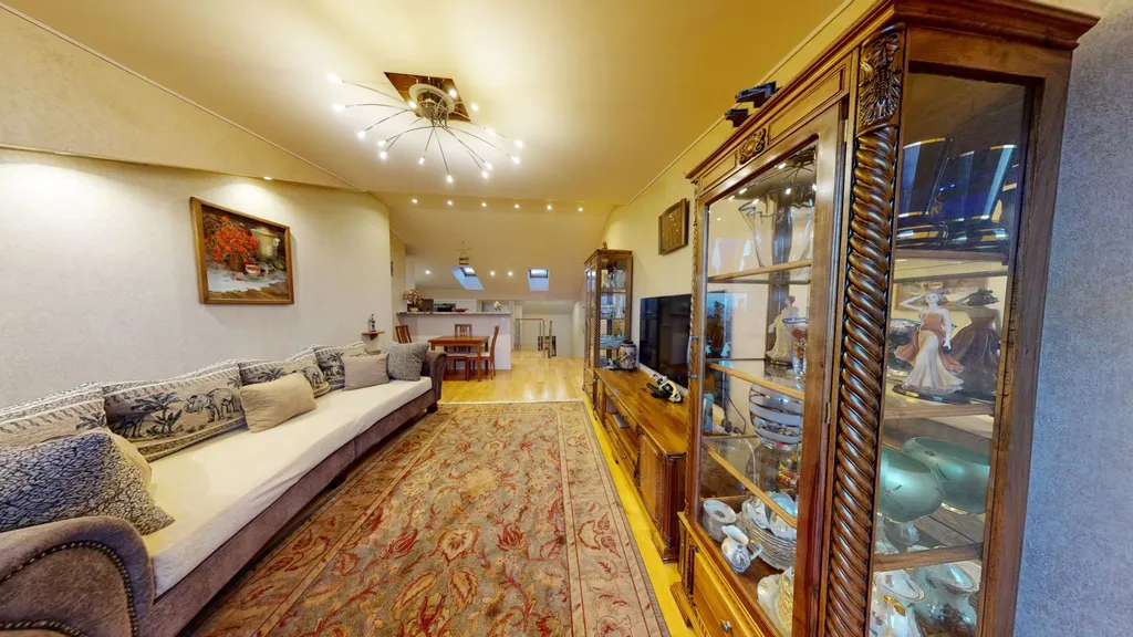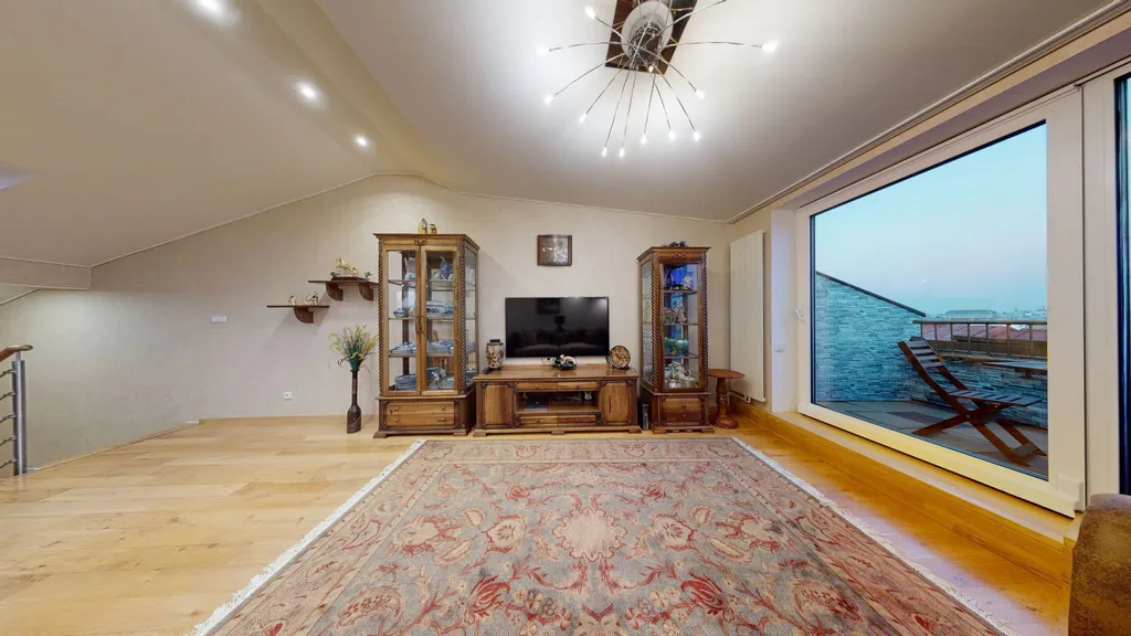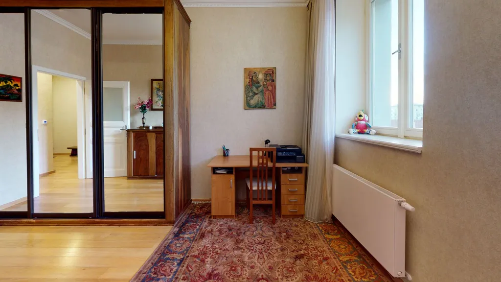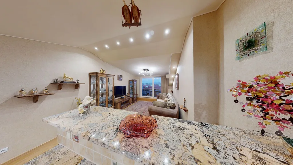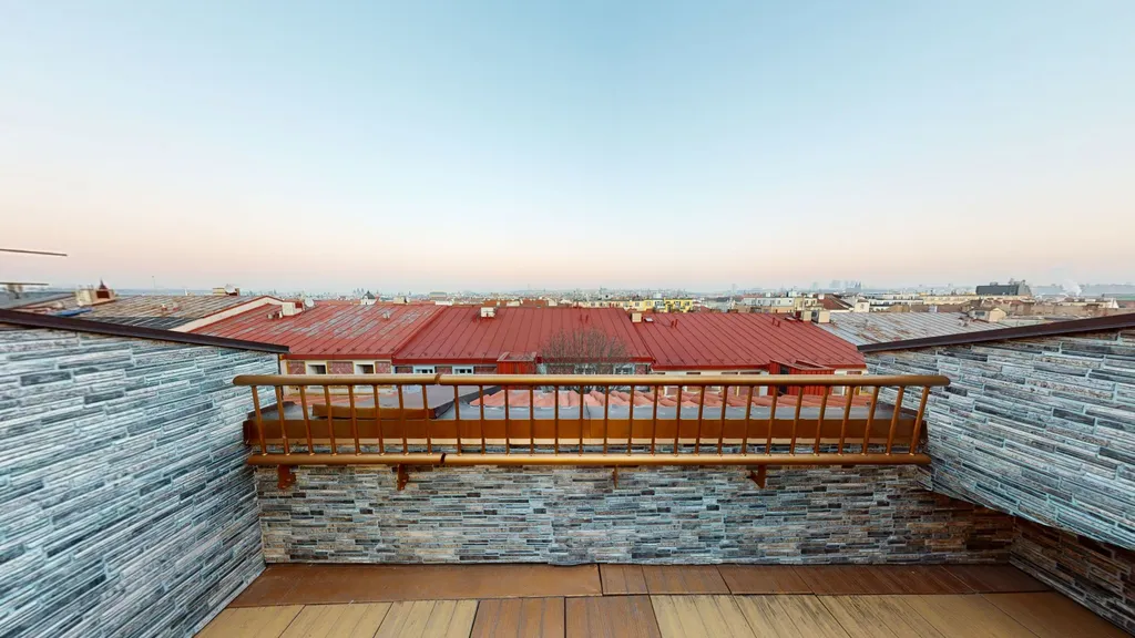 Luxusní byt s balkonem, který nabízí barevný výhled na památky Prahy. Nachází se v 5. patře budovy s výtahem. Obývací pokoj směřuje na východ, ložnice na západ. Přírodní africký kámen v kuchyni, veškerý ručně vyrobený nábytek z přírodního ořechu, chytrý dům - ovládání vytápění, klimatizace v obývacím pokoji (chlazení/topení), podlahy pokryté přírodními dubovými parketami a obrněné vchodové dveře na míru. Veškerý vestavěný nábytek je zahrnut v prodejní ceně. Kuchyň, myčka, digestoř, lednička, indukční varná deska, horkovzdušná trouba. Sanitární keramika značky JIKA.