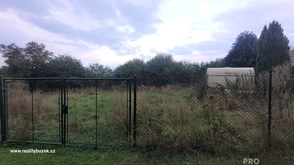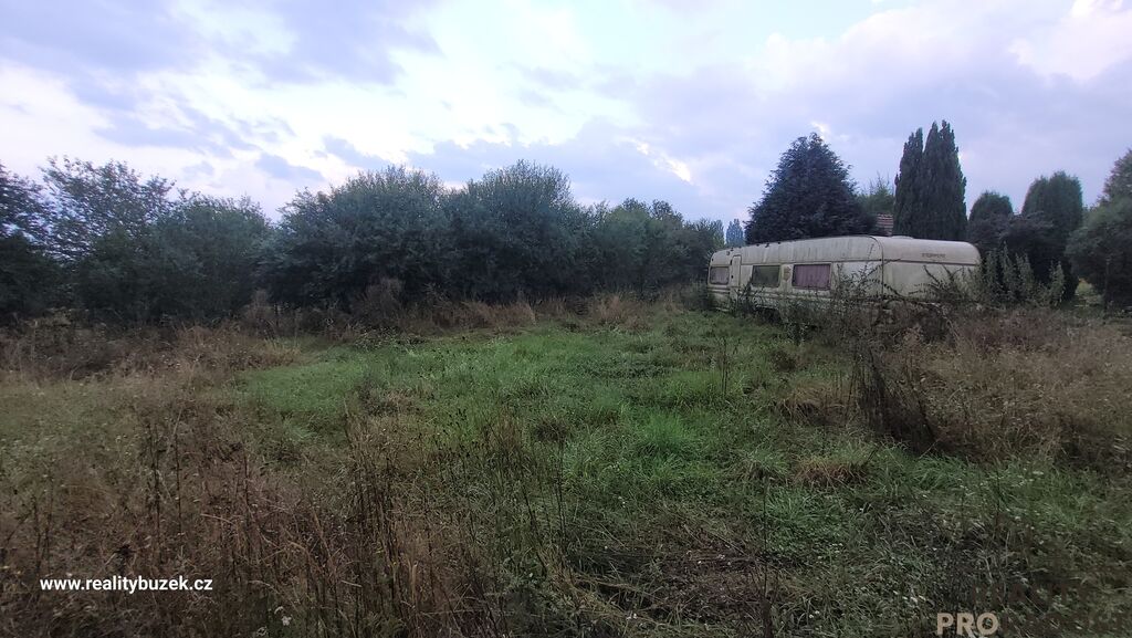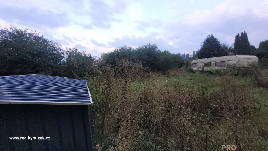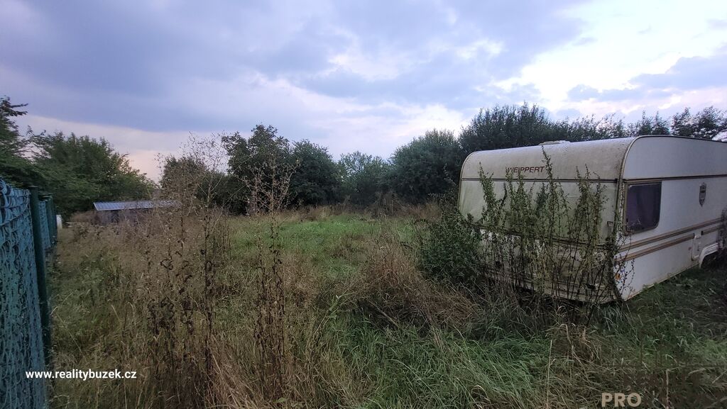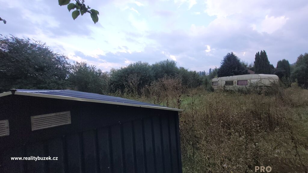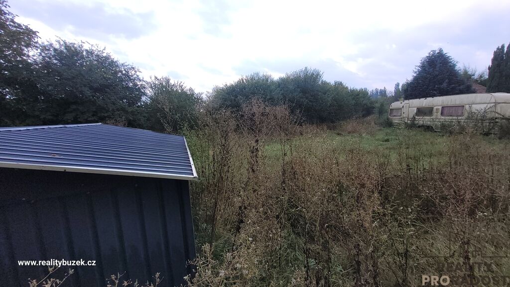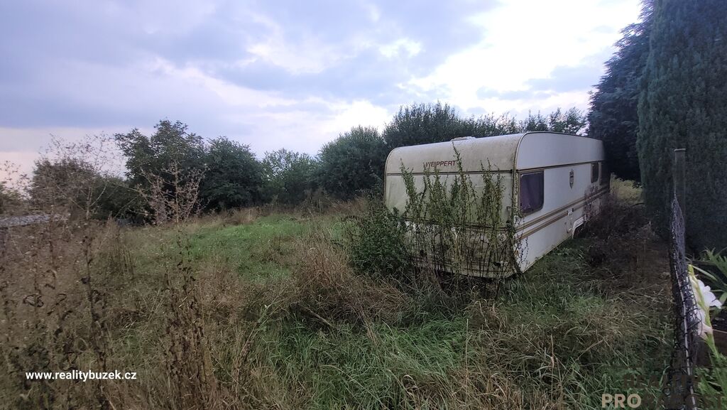 Zahrada je kompletně oplocena a opatřena bránou. Na pozemku je velký karavan.