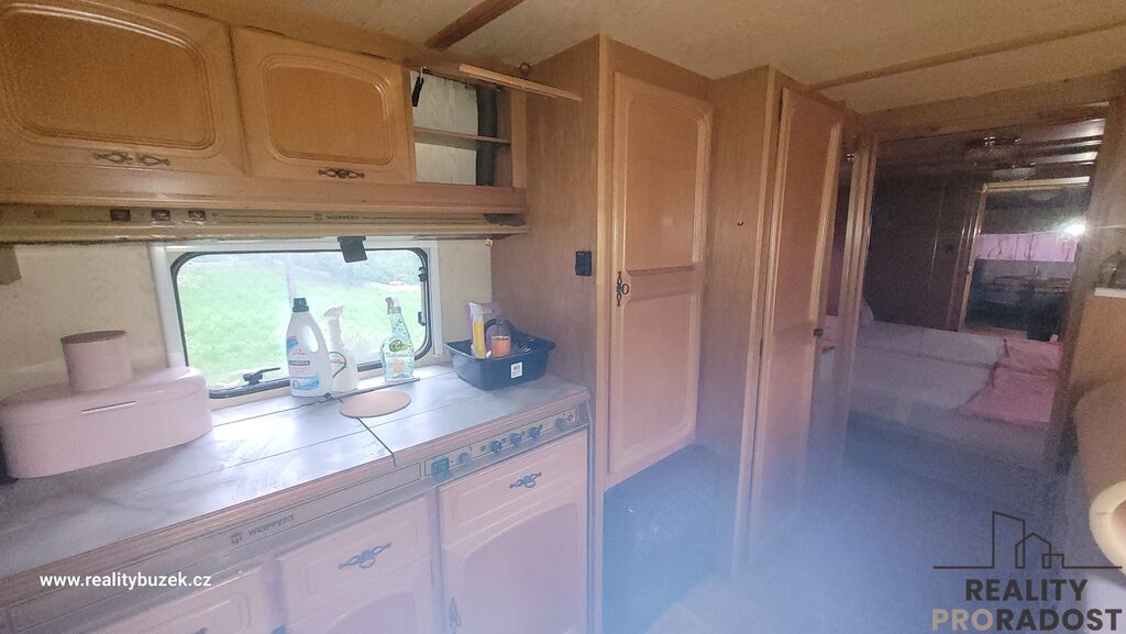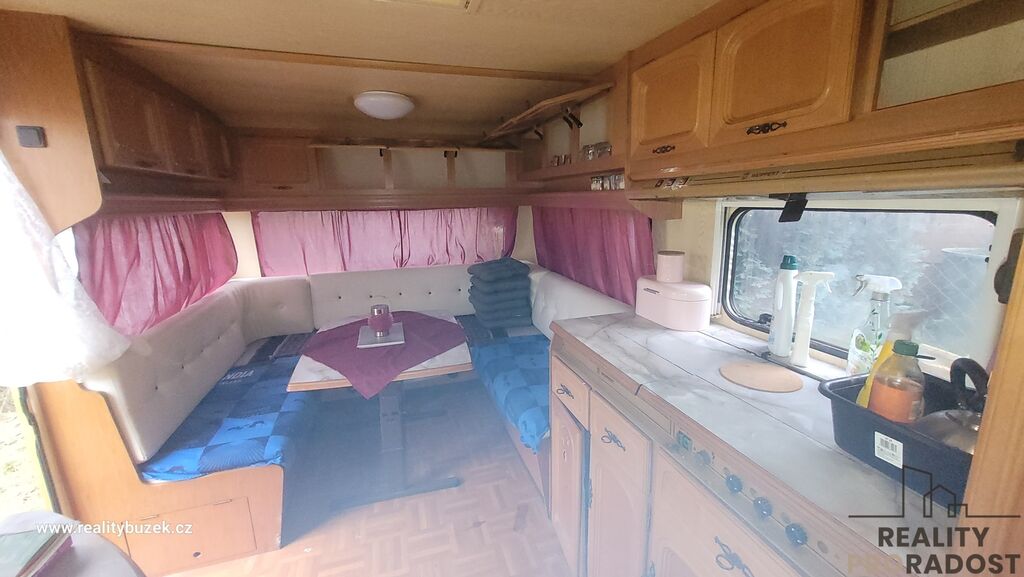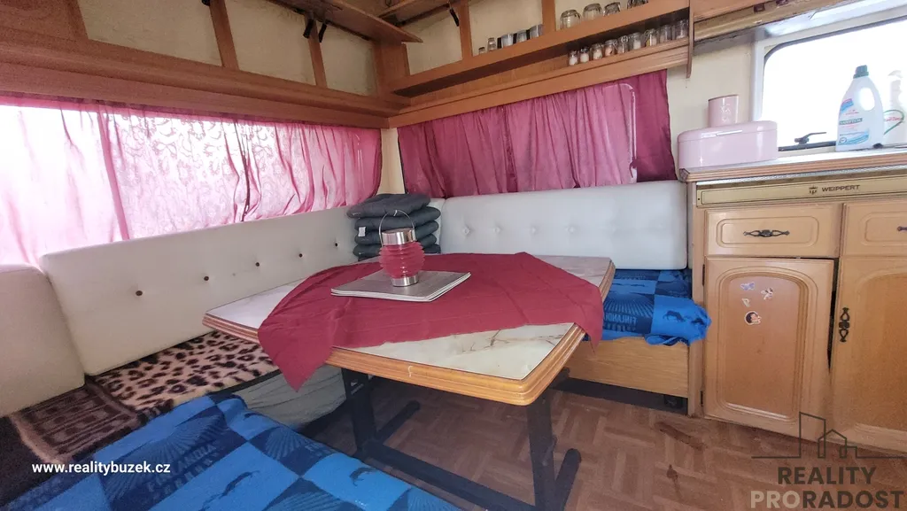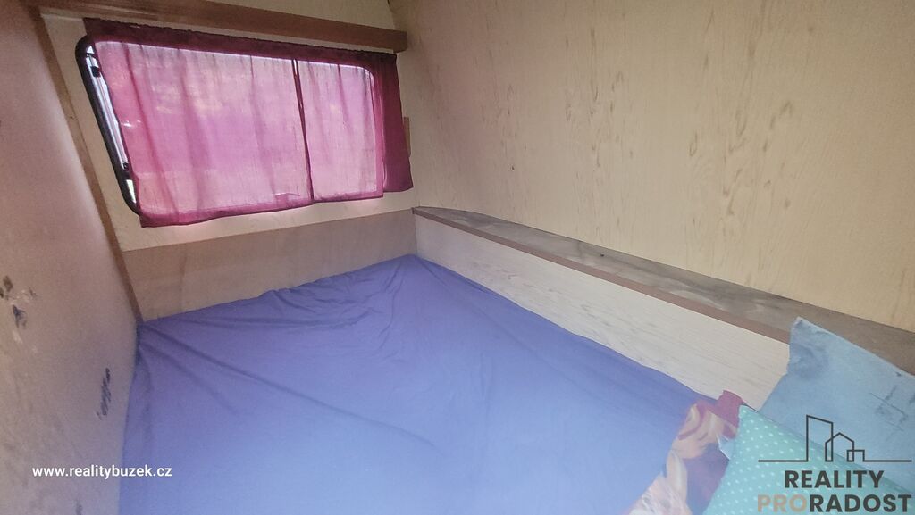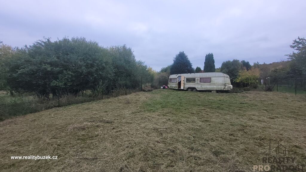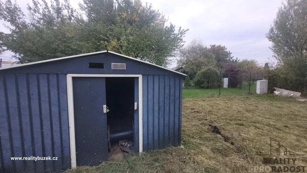 Zahrada je kompletně oplocena a opatřena bránou. Na pozemku je velký karavan, zahradní domek/10m2/ a suché wc .