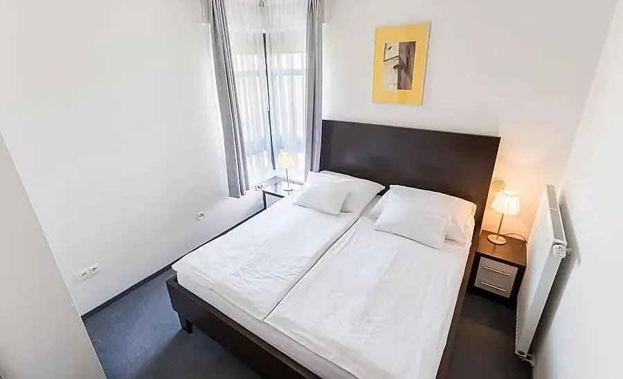 Obývací pokoj je zařízen moderním nábytkem pohodlnou rozkládací sedací soupravou, vinotékou a pracovním stolem. V ložnici je kvalitní postel s anatomickými matracemi a zatemňovacími závěsy pro klidný spánek.