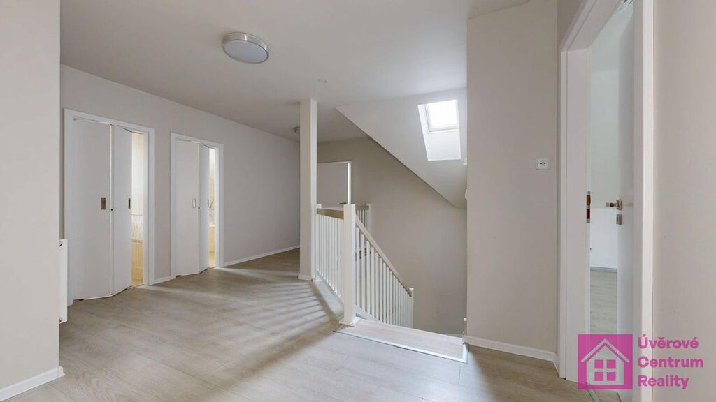 2.nadzemní podlaží: schodiště, pokoj, chodba, koupelna (vana), toaleta, pracovna a tři pokoje.