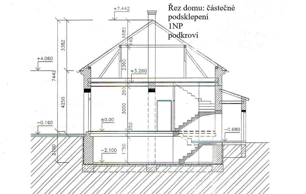 Tento dvojdům má jedno nadzemní podlaží, částečně je podsklepený a částečně má obytné také podkroví.