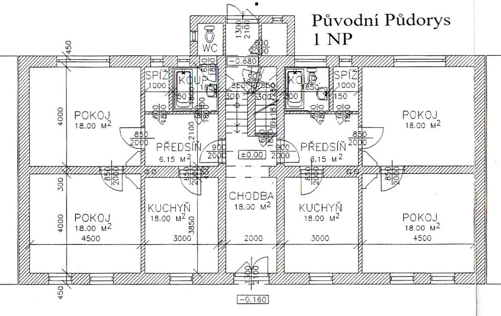 Z původních 2 pokojů + kuchyně, předsíně, spíže a koupelny viz. původní půdorys ve fokách, je nyní dispozice: