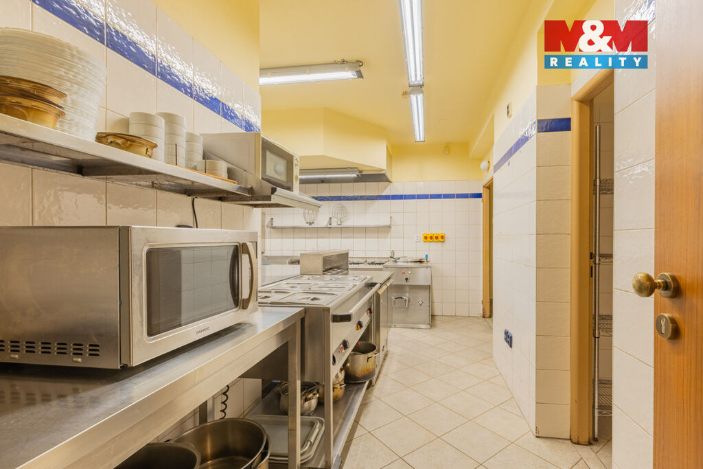 Součástí pronájmu je plně vybavená gastro kuchyně s moderním zařízením: konvektomat, plynový sporák, fritézy, ohřevná vana, výčepní zařízení, myčky, lednice a další potřebné vybavení. V zadní části objektu se nachází sklady, úklidové komory, šatny a toalety pro zaměstnance. Zásobování je řešeno samostatným bočním vchodem.
