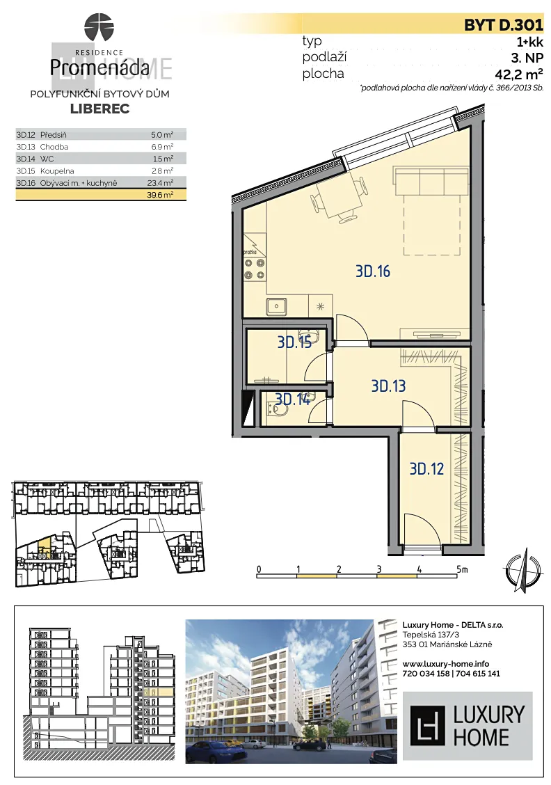 Nabízíme prodej bytu 1+kk o výměře 42,2 m2 + 20 m2 předzahrádka v projektu Residence Promenáda.