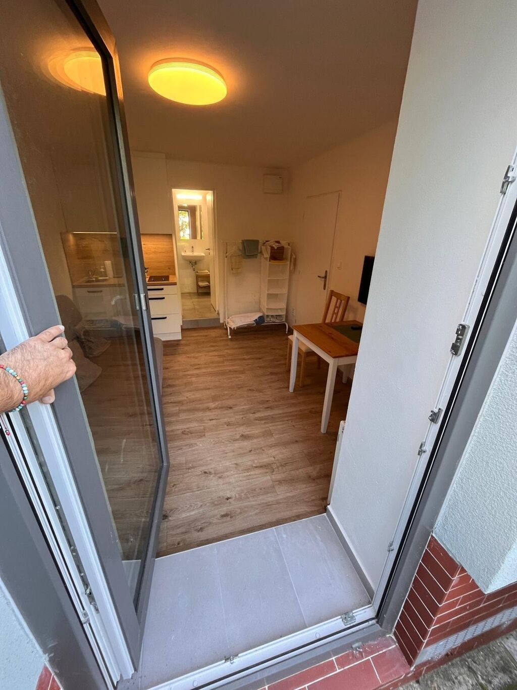 po vstupu do domu sejdete půl patra schodištěm dolů, byt je zateplený, koupelna se sprchovým koutem, umyvadlem, kotlem a toaletou, pokoj s kuchyňskou linkou, stolem a dvěma židlemi, rozkládací sedačkou, televizí a výstupem na terasu a zahradu (k dispozici)