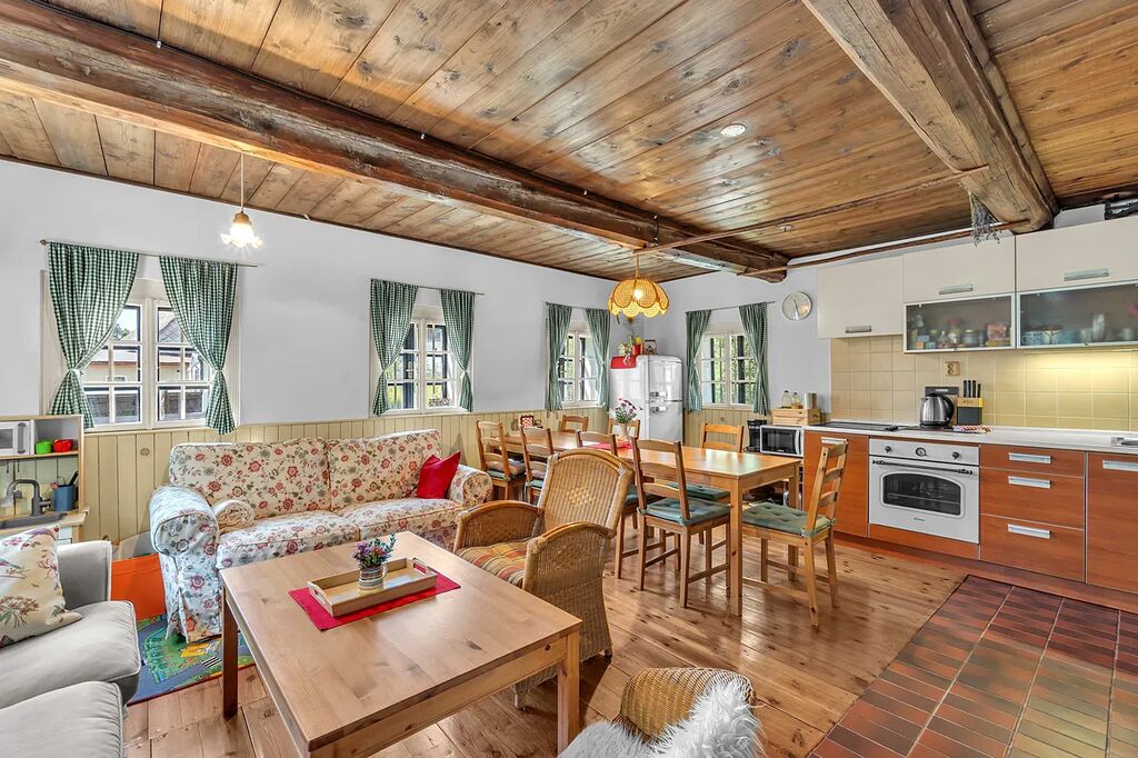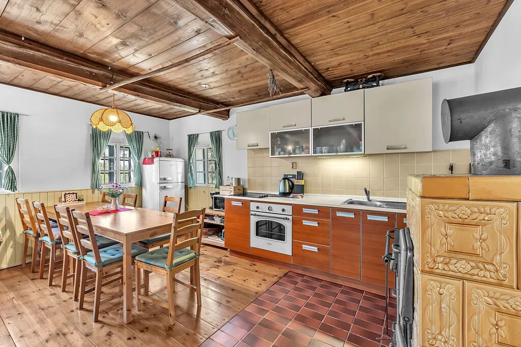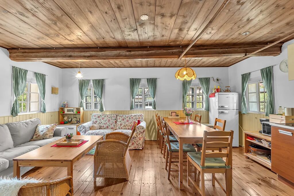 Prostorná světnice s funkčními kachlovými kamny a kuchyňským koutem