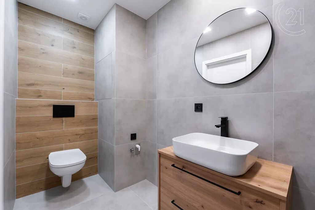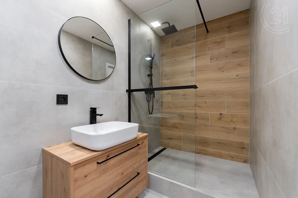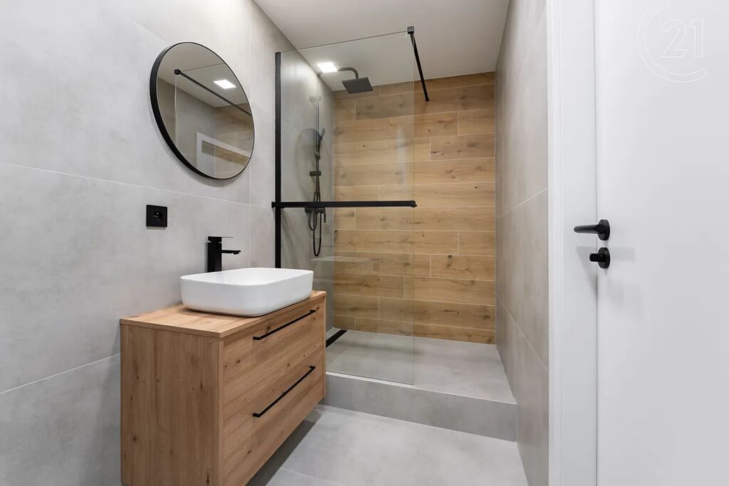 • Stylová koupelna se sprchovým koutem, velkoformátovými obklady, novým sanitárním vybavením, skříňkou pod umyvadlo a WC