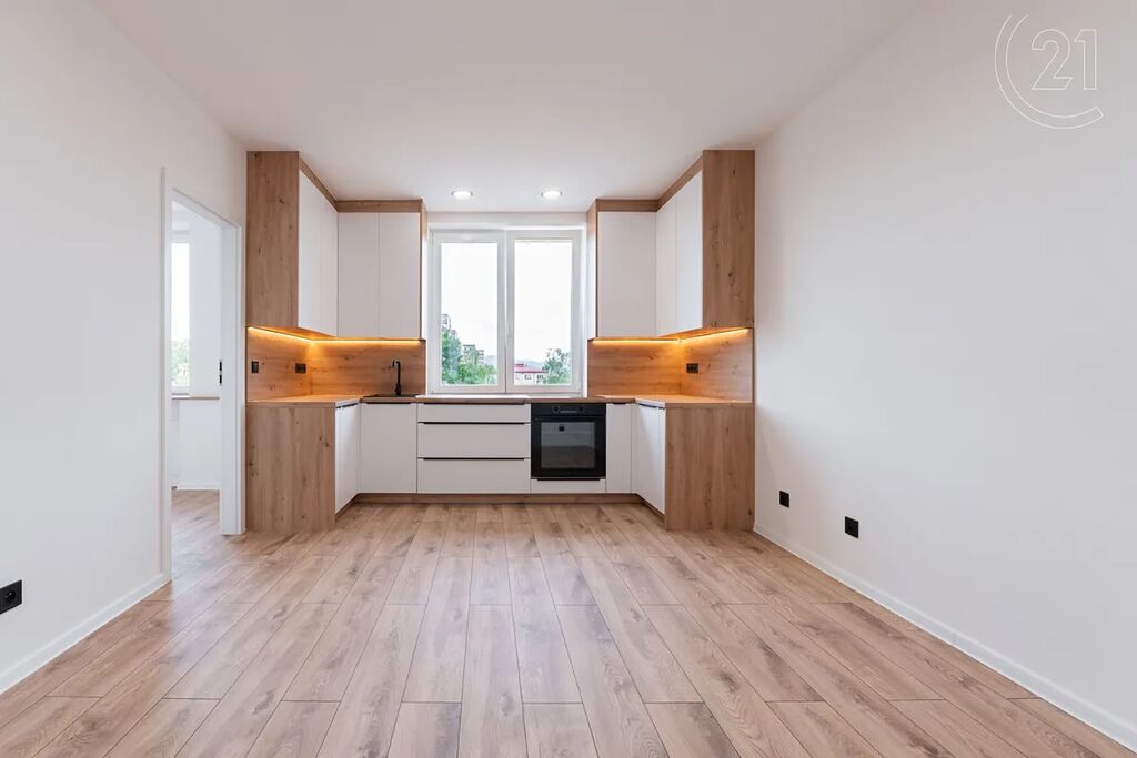 • Moderní kuchyňská linka (LED podsvícení) s vestavnými spotřebiči (myčka a elektrická trouba se sklokeramickou deskou) je propojena s obývacím pokojem (je tak vytvořen otevřený světlý obývací prostor)