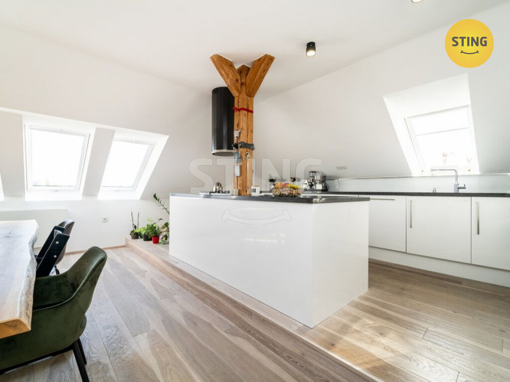 Nabízíme moderní podkrovní byt o vel. 4KK, ul. Porubská, Ostrava Poruba. Byt se nachází v 7.NP/7.NP, v cihlové zástavbě, v atraktivní části Poruby. Byt disponuje úžasným otevřeným prostorem, který je dřevěnými trámy a cihlovou stěnou rozdělen na zázemí kuchyňské (kuchyňská linka s ostrůvkem v bílém lesku na míru se spotřebiči: myčka, trouba, mikrovlnka, plynový sporák, digestoř, zabudovaná lednice, dostatečné množství úložného i pracovního místa), jídelní (designový rodinný stůl, pohodlné posezení i pro vícečlennou rodinu), obývací (prostor na sedačku, televizi). Ložnice a dětský pokoj je zvlášť, individuální vstup do těchto pokojů zajišťuje soukromí každého člena rodiny. Nápaditou rekonstrukcí majitel vyřešil i úložný prostor, skříně na míru, v bílém lesku, bonusem jsou dvě šatny. Koupelna - designové obklady, dlažba, vana, WC zn. GRÖHE (druhé WC stejné značky, vstup zvlášť). Byt nabízí i jedinečný prostor s velkými střešními okny - prosklené atrium, kde je možnost dalšího pokoje, pracovny či místo pro odpočinek. V dětském i obývacím pokoji zabudována klimatizace, na podlaze položena dřevěná podlaha zn. KÄHRS. Kondenzační plynový kotel zn. JUNKERS. Nízké náklady na bydlení 3.070,-Kč/3os (plocha bytu cca 180 m2). Při rekonstrukci majitel dbal na kvalitní provedení, špičkové materiály a vybavení. Byt nabízí komfortní bydlení i pro náročnější klientelu. Veškerá občanská vybavenost v místě adresy. Veškeré dotazy Vám ráda zodpovím telefonicky, či mailem. Těším se na prohlídku s Vámi. Do konce října 2025 nabízíme prostřednictvím našeho partnera úrokové sazby od 4,29 % p.a. Více informací Vám sdělí náš specialista na prohlídce.