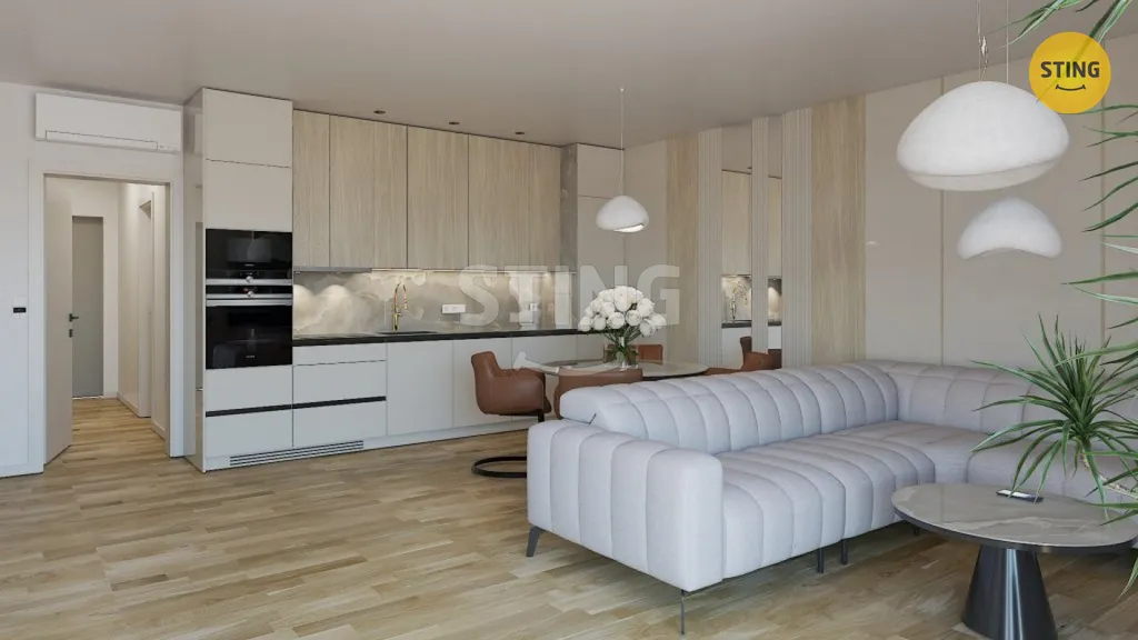 Byt nabízí moderní dispoziční řešení a je vybaven kvalitními materiály ve vysokém standardu, který je již zahrnut v ceně – např. klimatizace, venkovní žaluzie, podlahové vytápění a další. Interiér je navržen s důrazem na praktické, pohodlné a stylové bydlení.