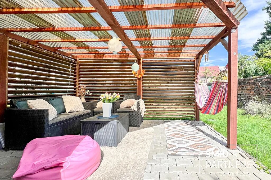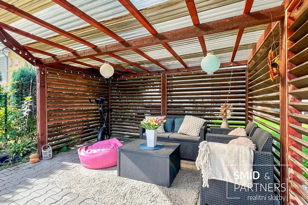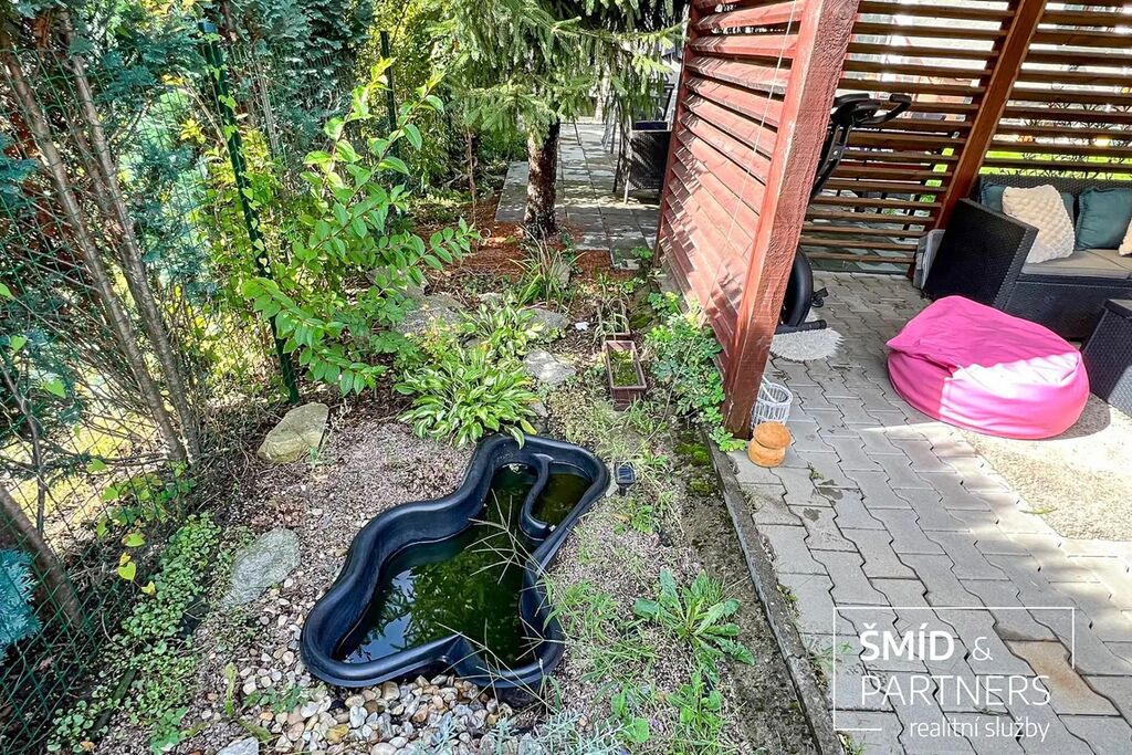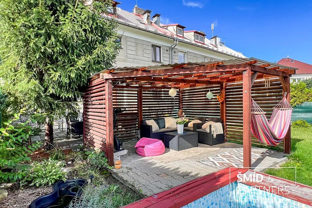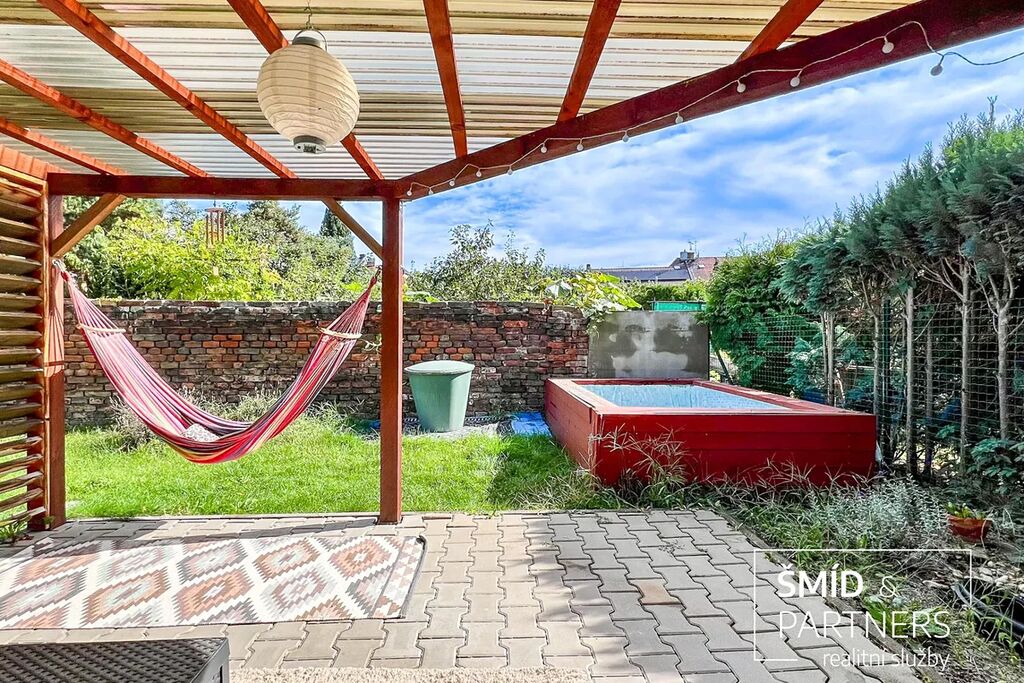 Velikým benefitem a příslušenstvím bytu je zahrada umístěná za bytovým domem mimo dosah hluku z ulice. K bytu náleží právo výhradního užívání její části odpovídající vlastnickému podílu na kterém si majitelé vybudovali prostornou zastřešenou pergolu, malý bazén a vytvořili tak malou oázu kde mohou posedět s přáteli, grilovat, relaxovat.