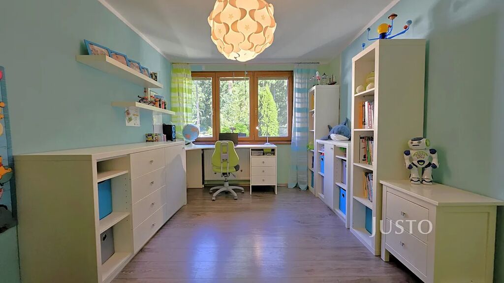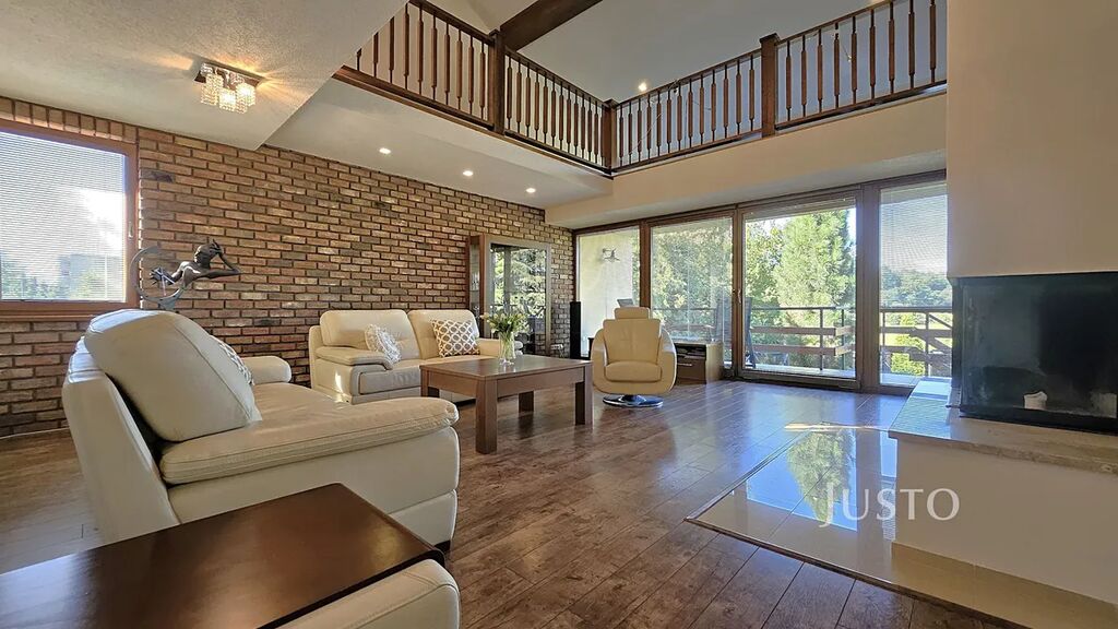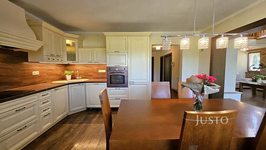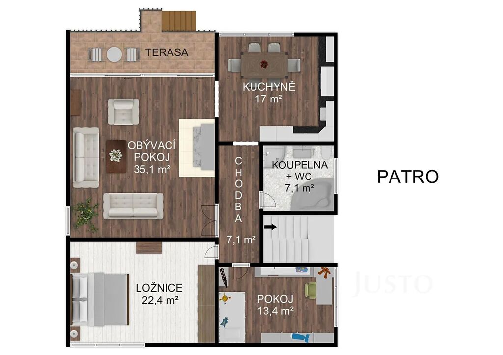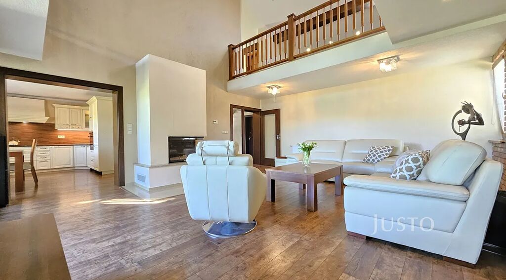 V 1. patře se nachází hlavní obytná část domu. Kuchyně s jídelnou (17 m² ) je laděna do stylu Provence. Dominantou obývacího pokoje (35,1 m²) jsou stylová krbová kamna a otevřená galerie. Z obývacího pokoje lze vyjít přímo na terasu (9,3 m²), dále do zahrady, mj. s pergolou. Dále jsou zde umístěny ložnice (22,4 m²)a dětský pokoj (13,4 m²). Koupelna s vanou, sprchovým koutem a WC (7,1 m²) je zajištěna přímým odvětráním a denním světlem.