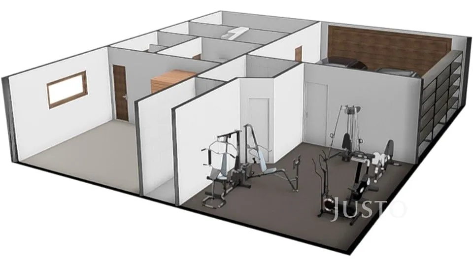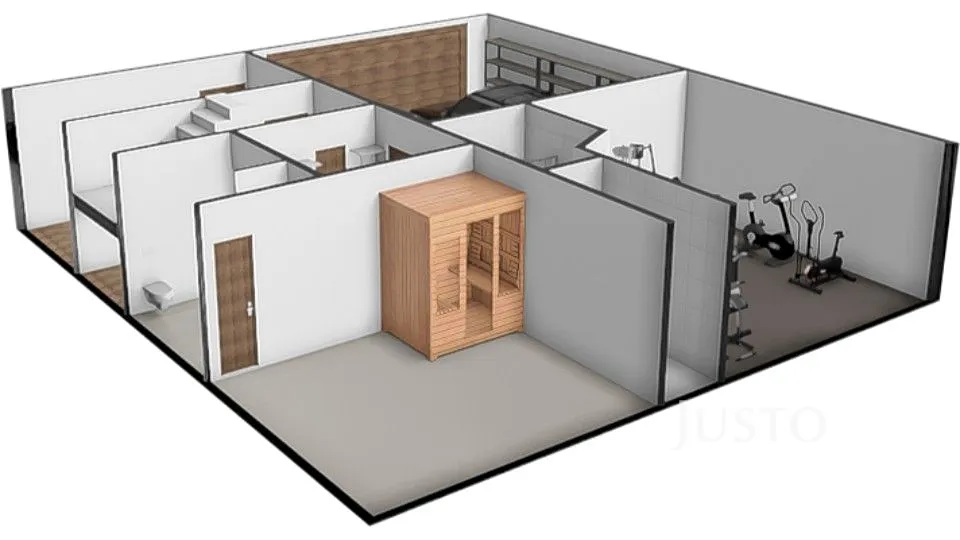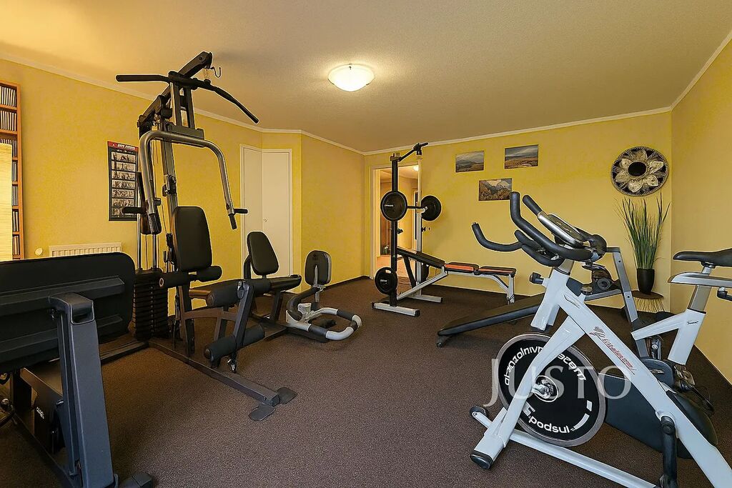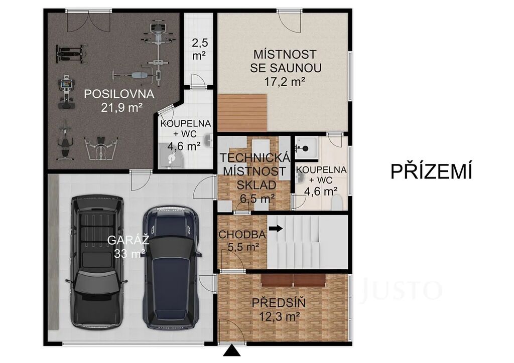 V přízemí se nachází velkorysá vstupní hala (12,3 m²), dodává celému interiéru vzdušný ráz. Hala navazuje přímo na garáž (33 m²)pro dva osobní vozy. K dalšímu ev. parkování poslouží zpevněná plocha před garáží. Další části přízemí je posilovna (21,9 m²), místnost se saunou (17,2 m²), která je s vlastním sprchovým koutem a toaletou. Z obou těchto místností lze vyjít na zahradu s bazénem. Místnost se saunou by bylo možné upravit k trvalému bydlení nebo případně k využití pro drobné podnikání. Technická místnost (6,5 m²) tč. slouží jako spíž a úložné prostory.