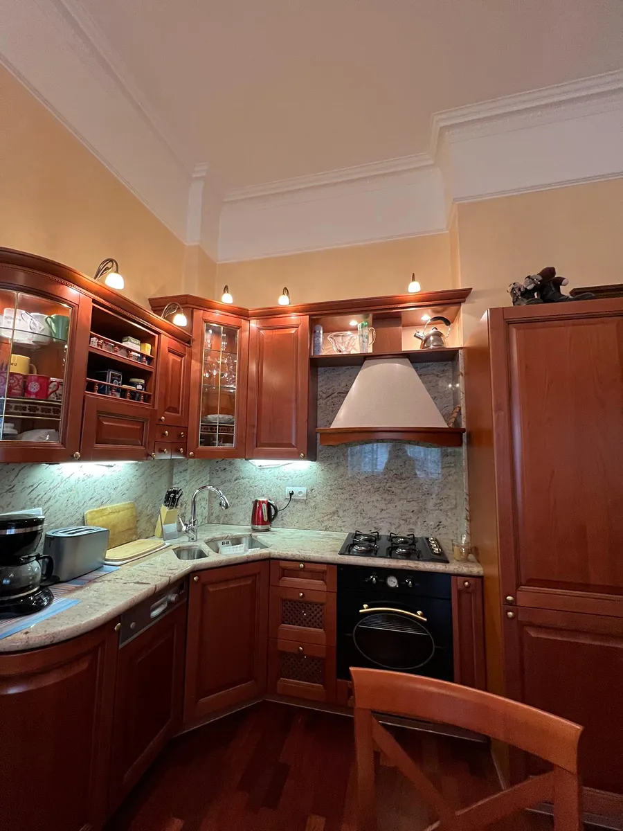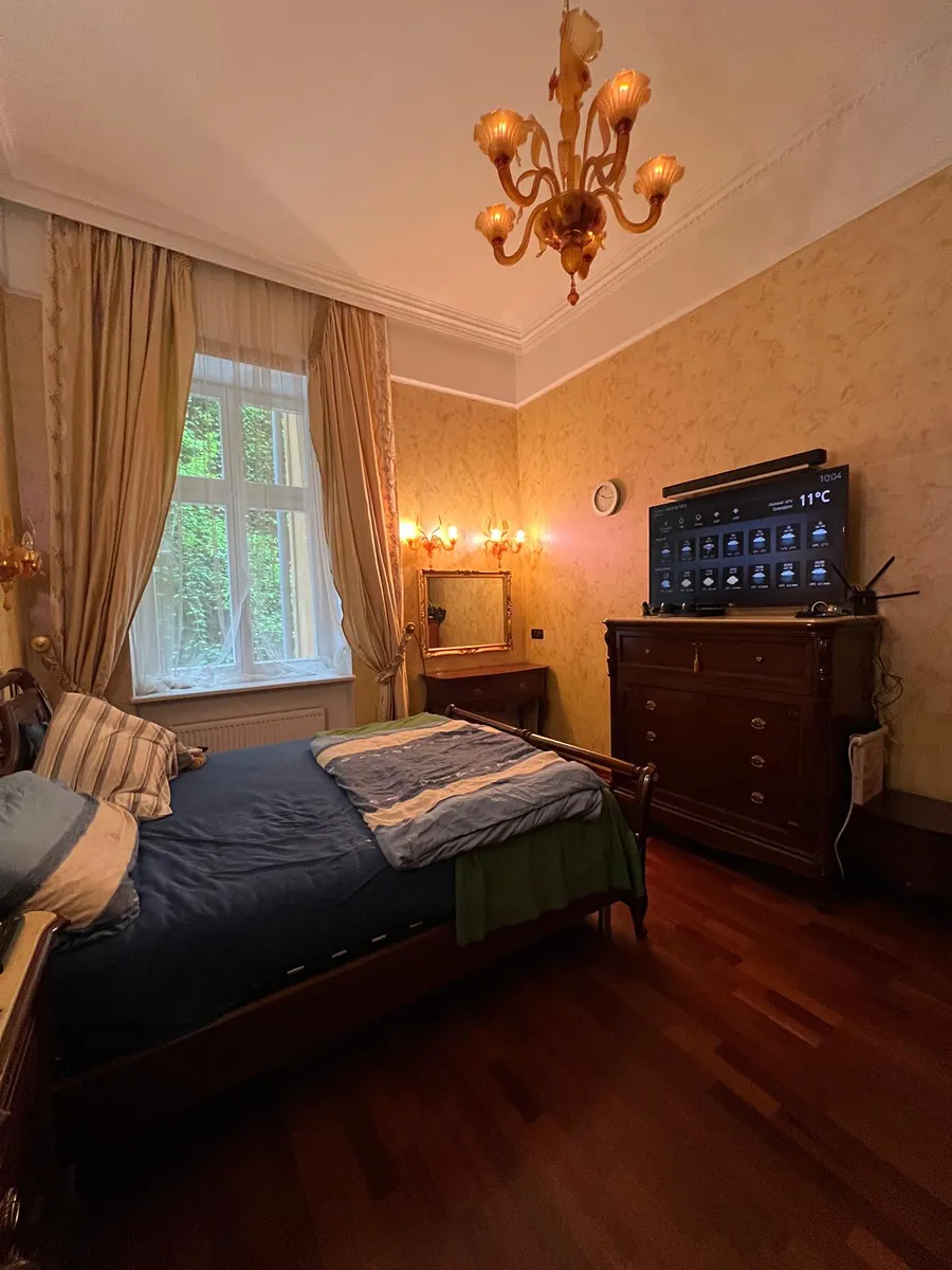Byt je velmi hezky zařízený nábytkem na míru, s dominantní kuchyní a jídelnou s obývací částí, z předsíně je vchod do hezky vybavené koupelny. Dále je směrem a okny do parku klidná ložnice s mnoha odkládacími vestavbami.