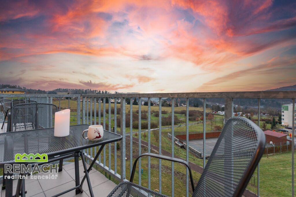 Obývací pokoj je prostorný světlý s moderní kuchyňskou linkou a přímým vstupem na balkon s výhledem.