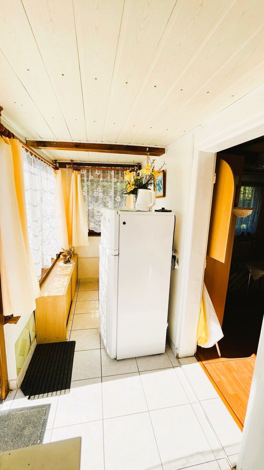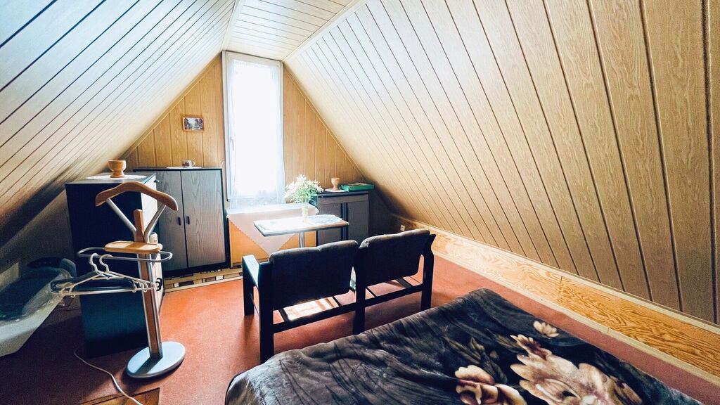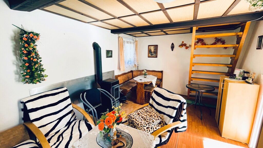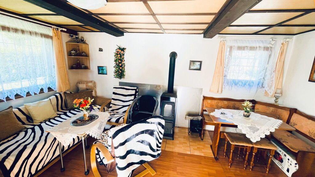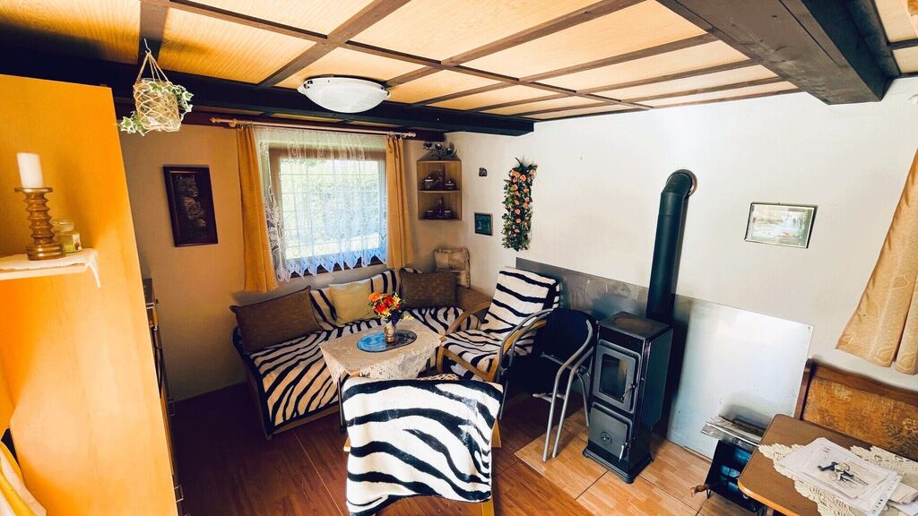 Samotná chata je kombinací zděné podezdívky a dřevěné nadstavby, což jí dodává kouzlo i stabilitu. V přízemí vás přivítá útulný obývací pokoj s malou kuchyňkou, kde dominují krbová kamna – nejen že vytopí celý prostor, ale také vytvářejí jedinečnou atmosféru domova. V podkroví najdete spací místnost, která pohodlně pojme více lůžek. Chata je udržovaná, plně vybavená a připravena k okamžitému užívání.