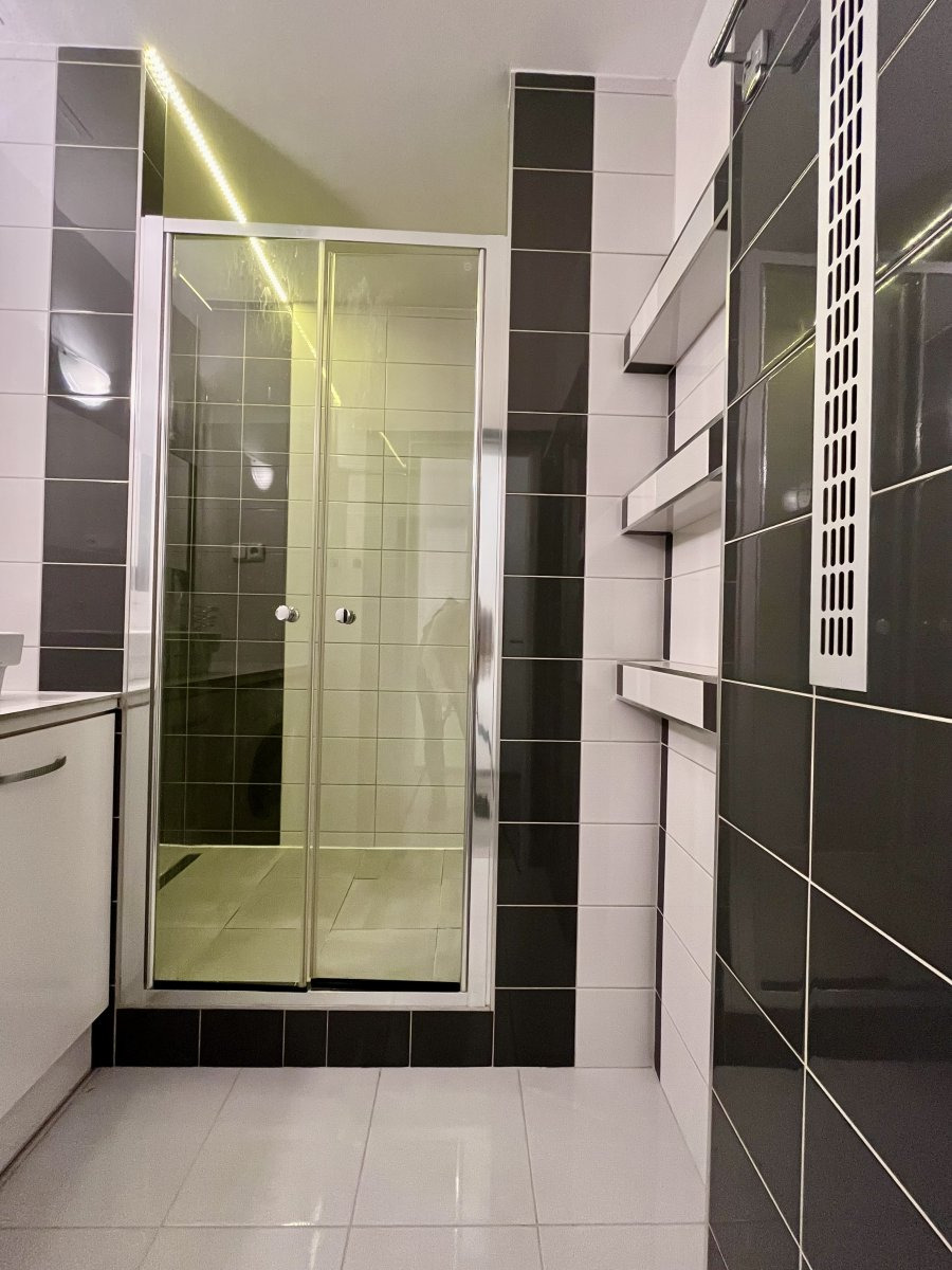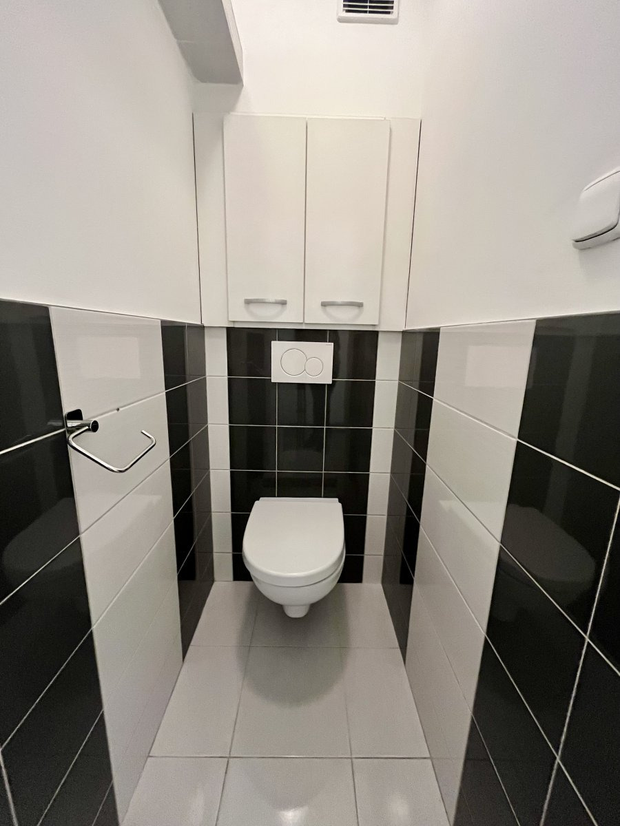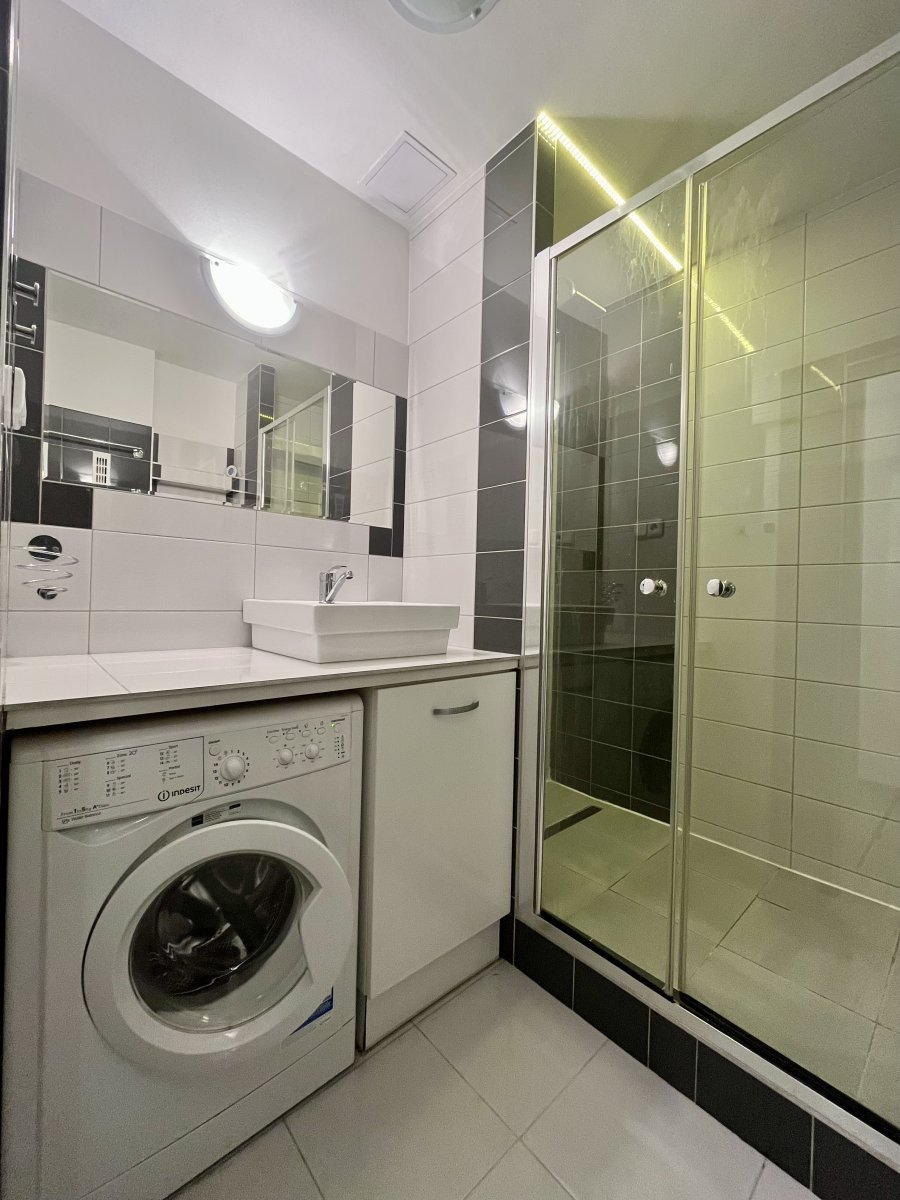 Koupelna disponuje sprchovým koutem a pračkou. Toaleta je umístěna samostatně.