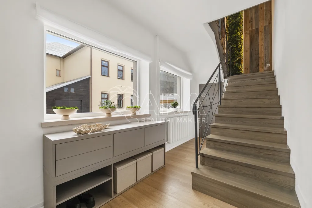 V přízemí: Z prostorné haly se dostanete do obývacího pokoje s kuchyňským koutem, koupelny, prádelny a pokoje pro hosty. Nechybí zde ani praktická úklidová místnost.