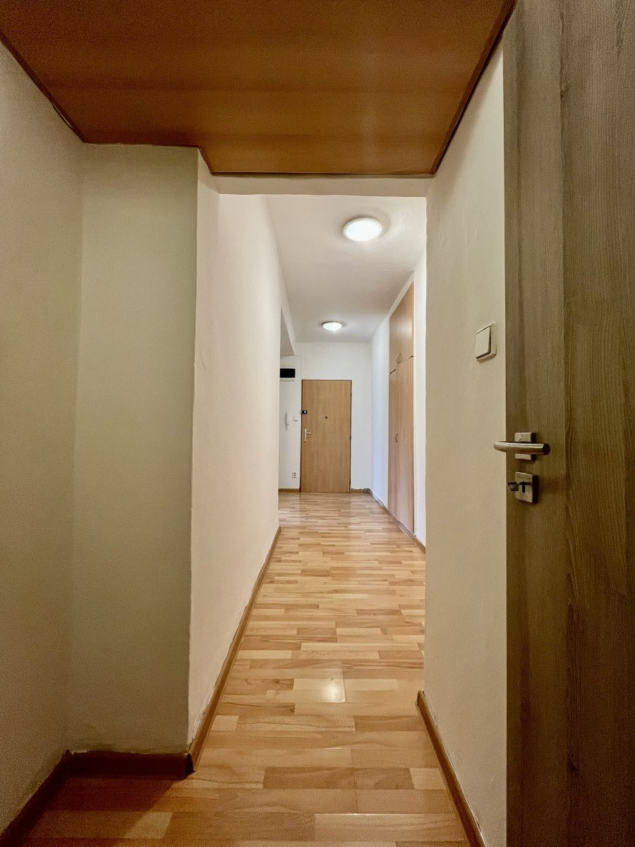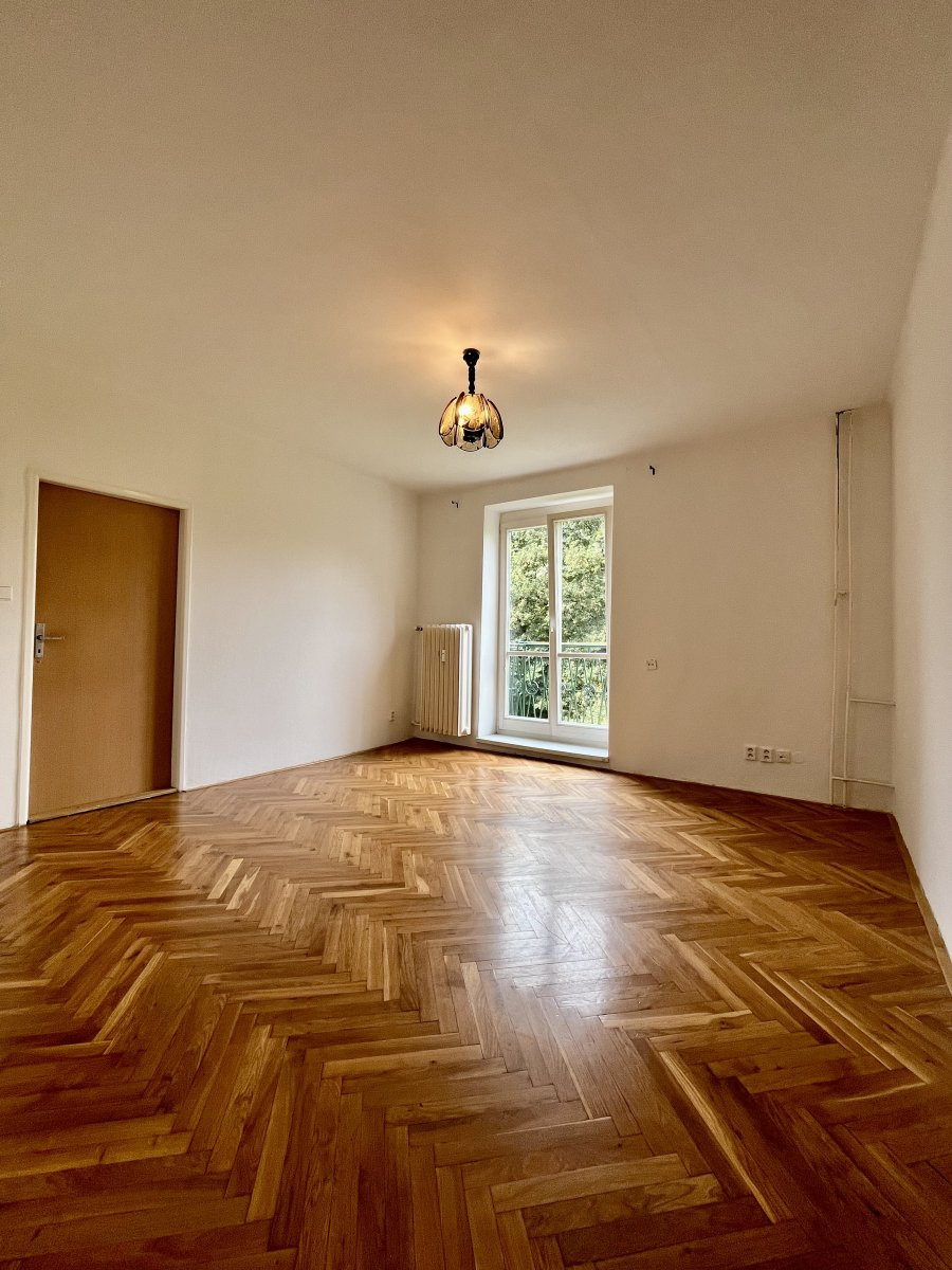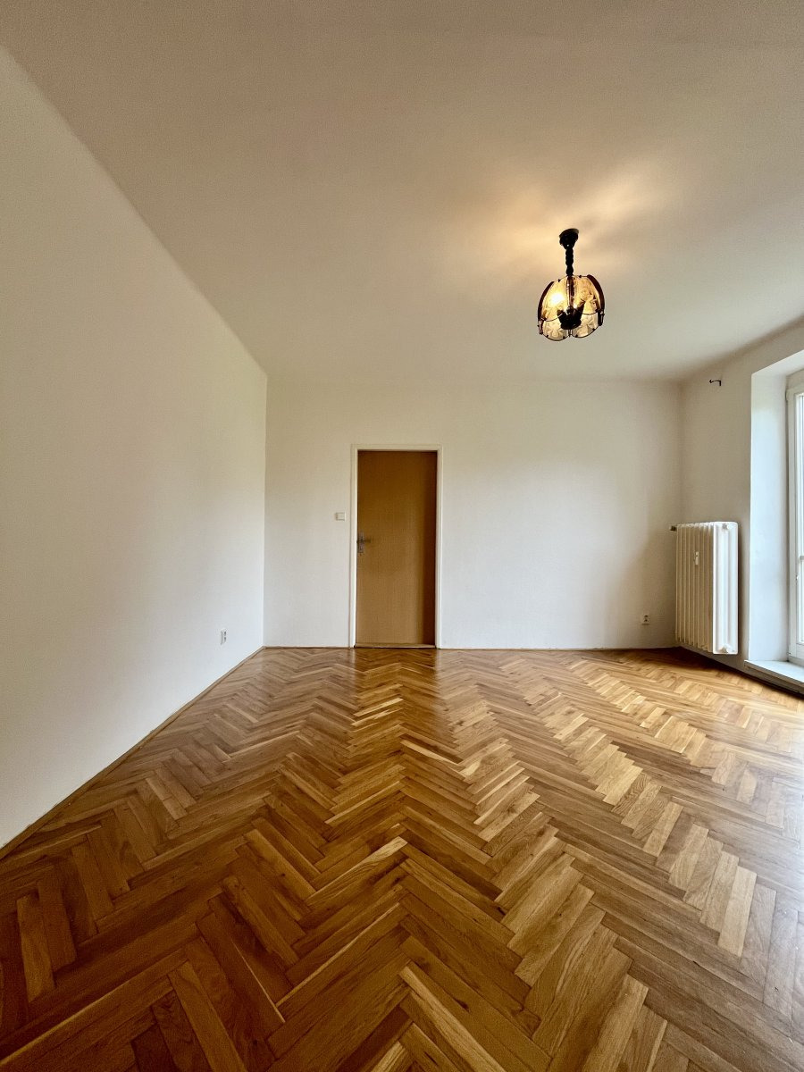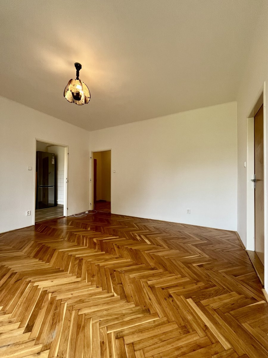 Nabízí jeden neprůchozí pokoj v zadní části bytu. Z průchozího pokoje se dostaneme na balkon a do velké chodby se skříněmi.