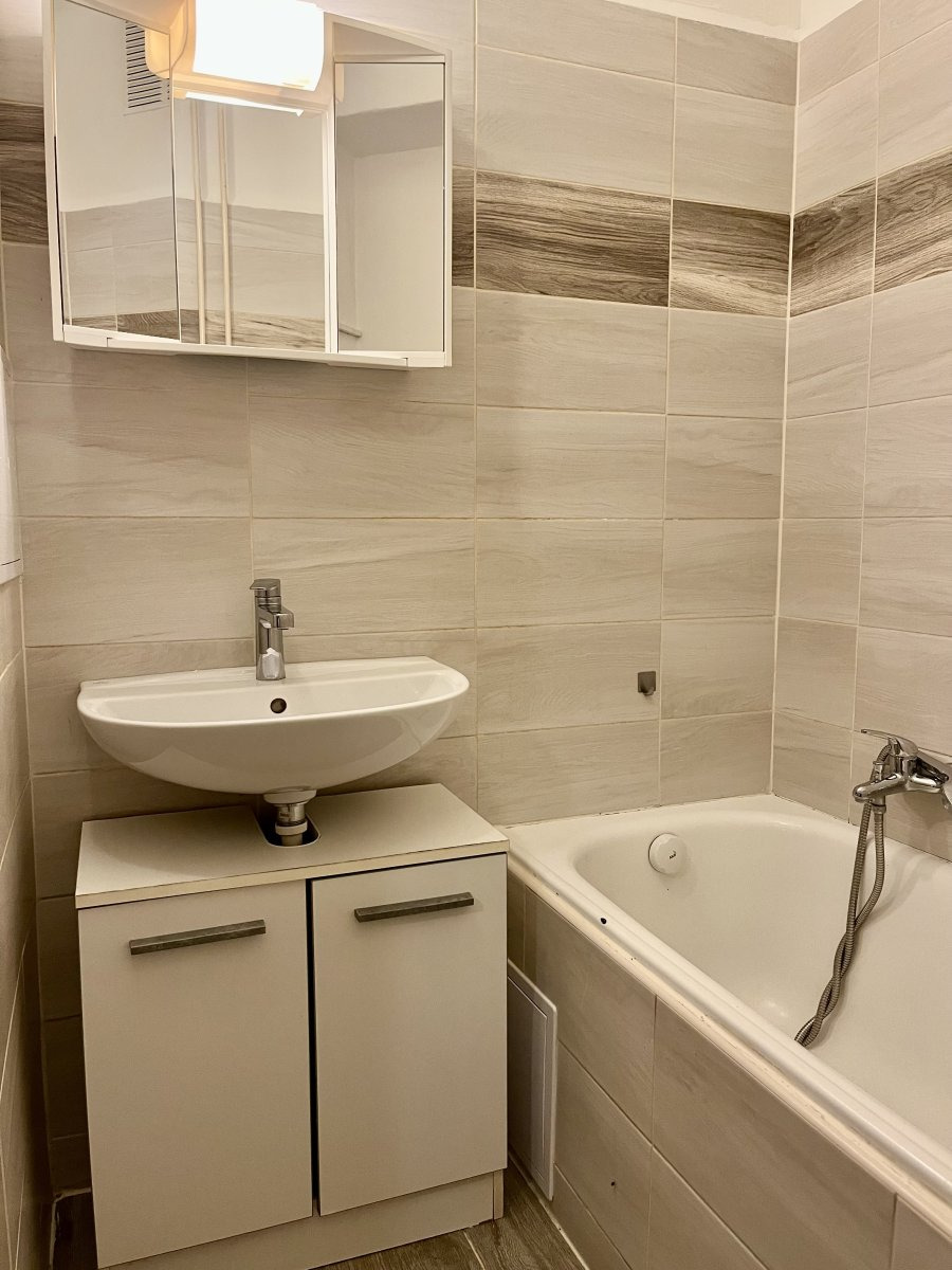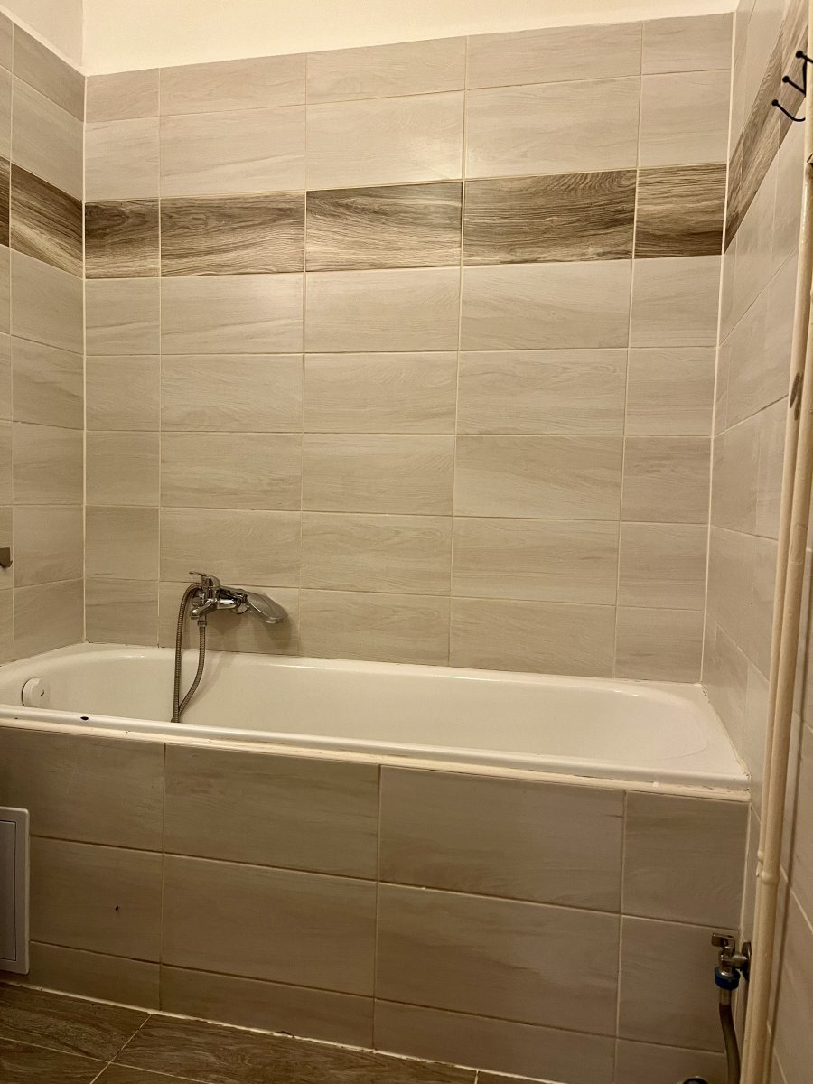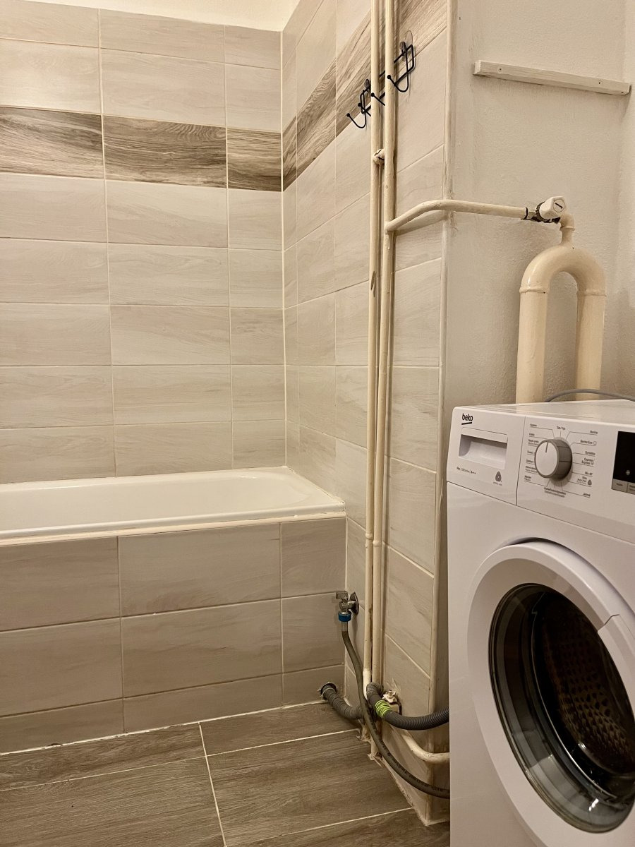 Koupelna disponuje vanou a pračkou.