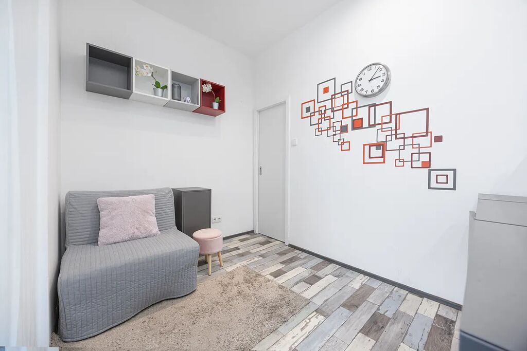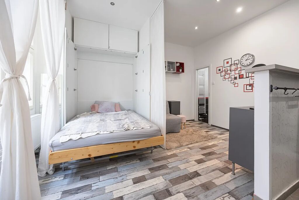 • chytré řešení spaní – sklopná postel integrovaná do vestavné skříně, která šetří prostor
