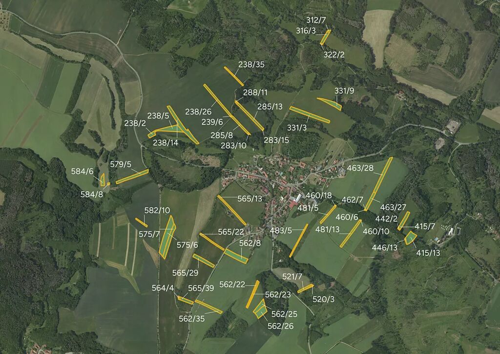 Pozemky mají parc. č. 564/4, 584/8, 584/6, 460/10, 460/6, 446/13, 415/13, 285/13, 239/6, 442/2, 582/10, 579/5, 575/7, 575/6, 565/39, 565/29, 565/22, 565/13, 562/35, 562/26, 562/25, 285/8, 283/15, 283/10, 483/5, 481/13, 481/5, 463/28, 463/27, 462/7, 415/7, 331/9, 331/3, 322/2, 238/35, 238/26, 238/14, 238/5, 238/2, 562/8, 562/23, 460/18, 316/3, 312/7, 288/11, 521/7 a 520/3.