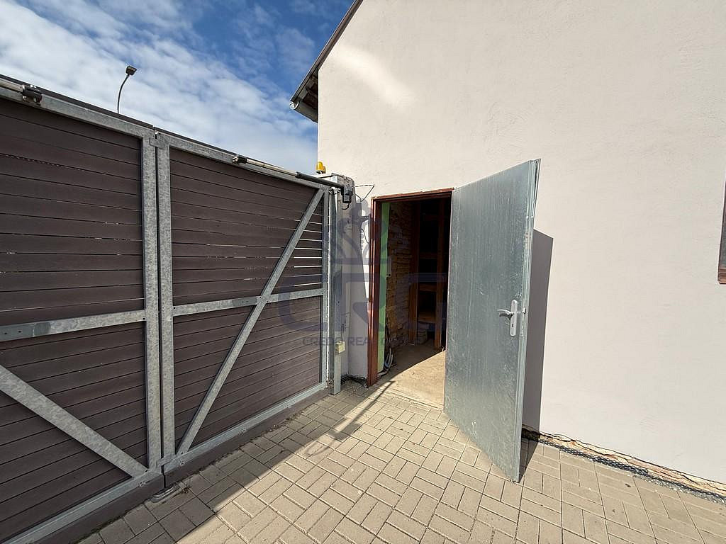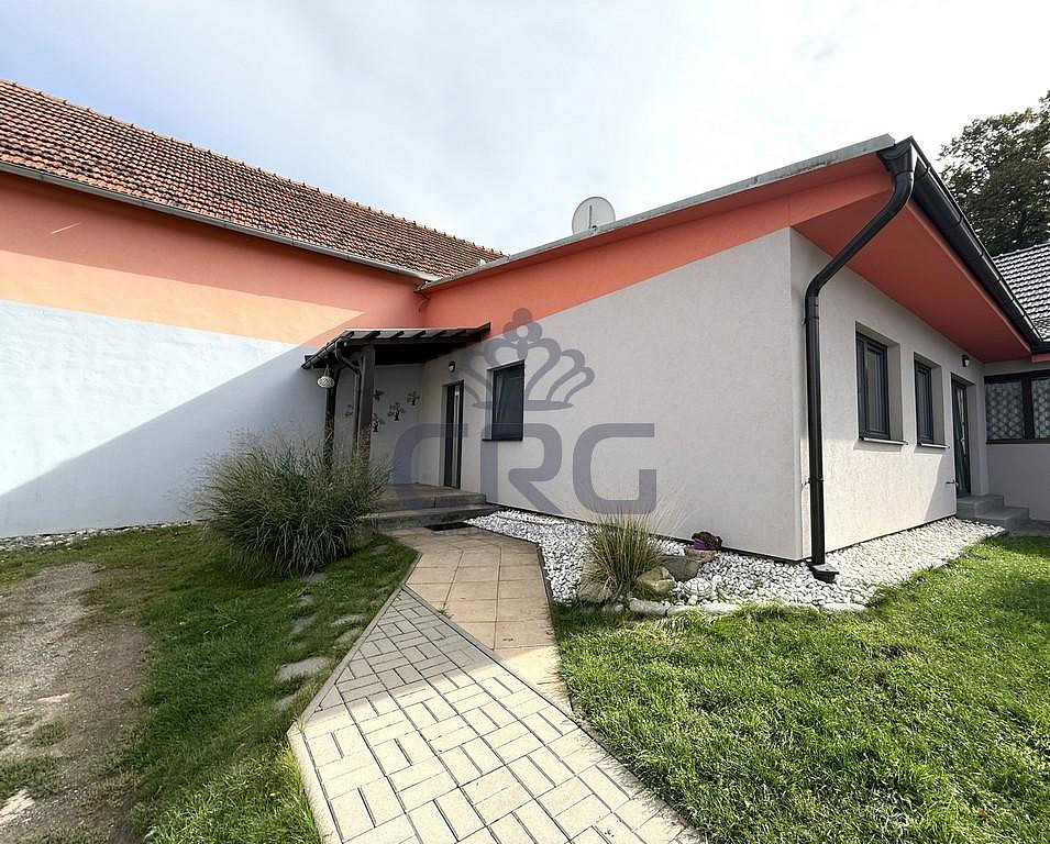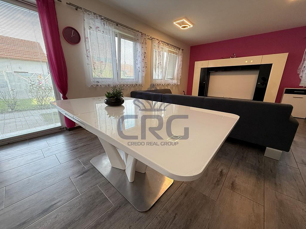 Při vstupu do nemovitosti se ocitneme v prostorné předsíni o velikosti cca 7,5 m². V místnosti je dostatek prostoru pro skříň či věšák pro odkládání. Dále pokračujeme do velkého obývacího pokoje, který je spojen s kuchyňským koutem. Velikost této místnosti je cca 50 m². Kuchyňská linka je vybavena sklokeramickou deskou, myčkou, troubou lednicí s mrazákem a digestoří. Součástí této místnosti je i komora či sklad s regály o velikosti cca 2,7 m². Z této části vejdeme po dvou schodech do příjemné světlé chodby o výměře cca 9,31 m², ve které je vestavná skříň se spoustou úložného prostoru a nachází se v ní i kotel, který zajišťuje vytápění domu samotného. Z chodby je vstup do ostatních samostatných místností v domě. Je zde nádherná velká koupelna o velikosti cca 6,6 m², ve které je k dispozici vana, toaleta a umyvadla. WC je samostatné a jeho výměra je cca 1,5 m². V domě jsou dva pokoje, z toho místnost, která původně sloužila jako dětský pokoj je o velikosti cca 15,1 m². Druhá místnost, která původně sloužila jako ložnice, má vlastní šatnu s vestavnými skříněmi a její celková plocha činí cca 18,7 m².