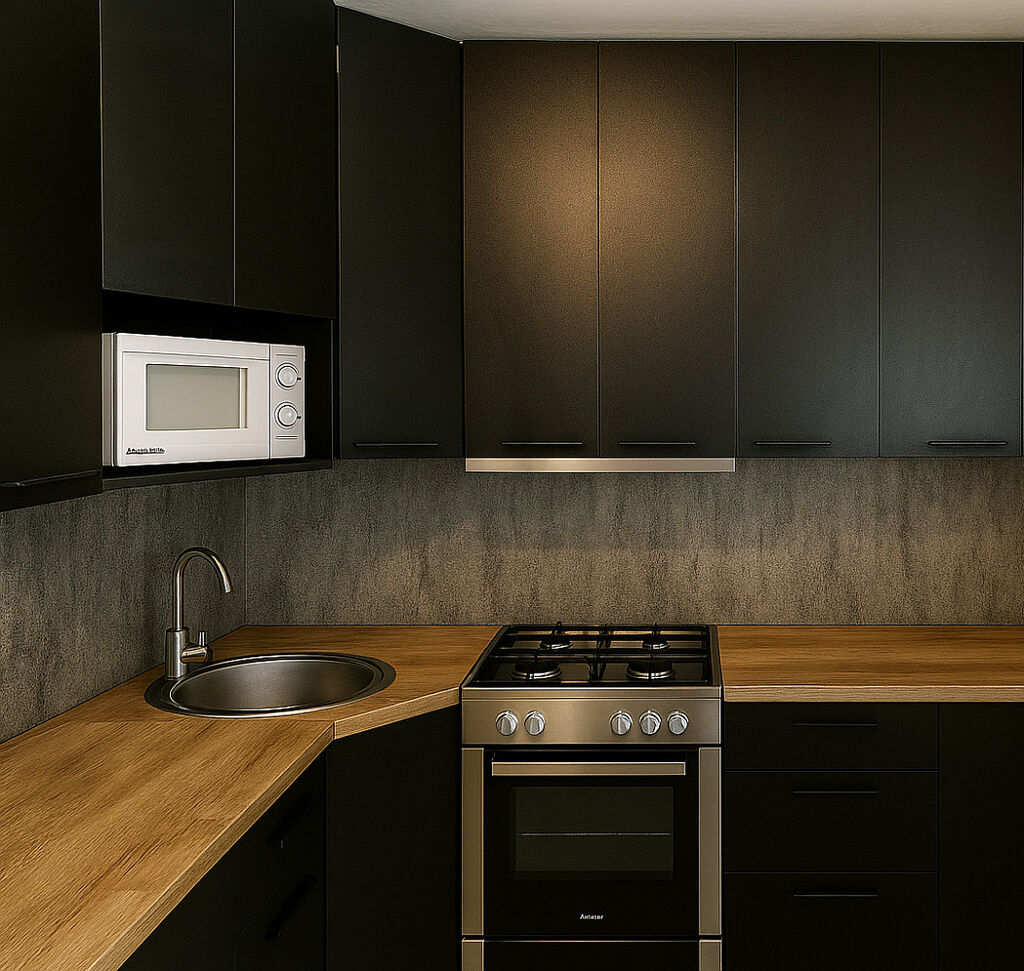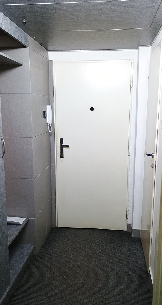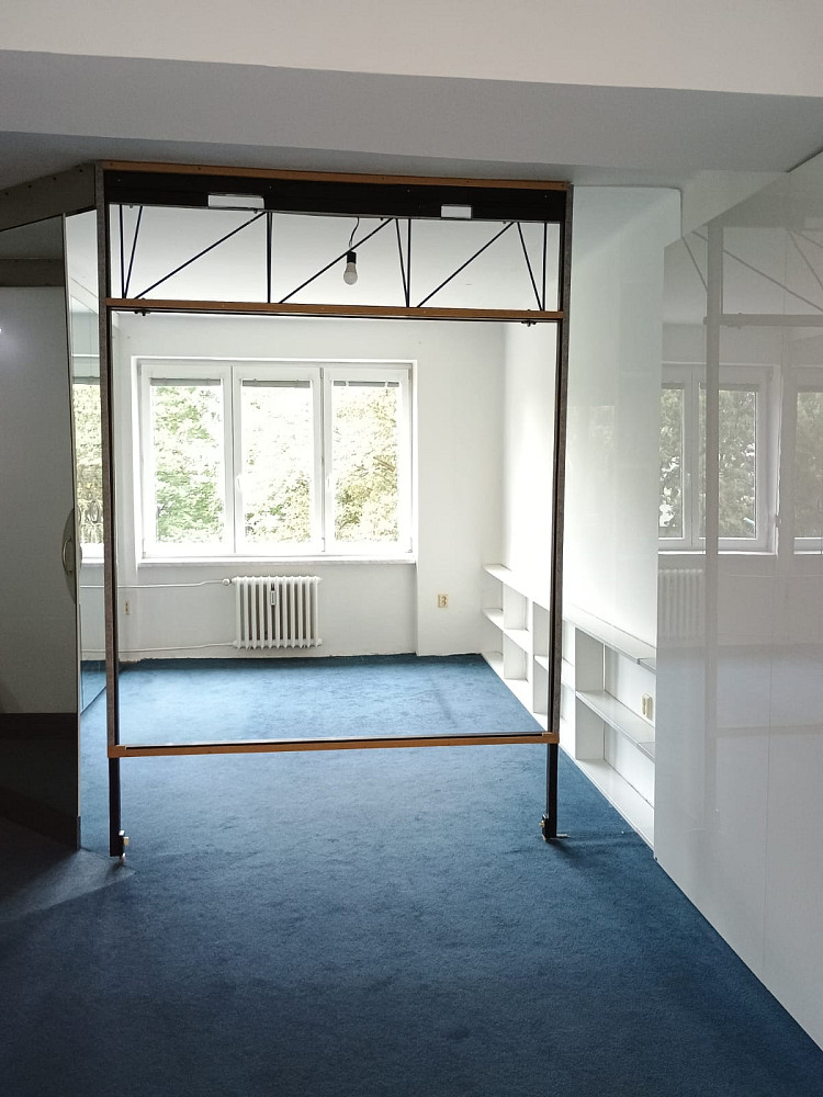 Po vstupu do bytu vás přivítá předsíň laděná do elegantní šedé barvy, zde je vstup do samostatného WC s malým umyvadlem, rovněž v šedém tónu. Kuchyně je v moderním černém designu, vestavěné spotřebiče jako myčka, pračka, mikrovlnná trouba a lednička vytvářejí prostor, kde je radost vařit i trávit čas. Koupelna je stylová a neotřelá – modrá vana, plechové umyvadlo a šedé kachličky tvoří harmonický celek, který zaujme každého milovníka designu. Hlavní obytný prostor vznikl spojením dvou pokojů do jednoho velkého, vzdušného celku. Díky chytrému řešení je možné prostor kdykoliv rozdělit – pomocí stropní zástěny a zasouvací zrcadlové stěny si vytvoříte soukromí podle potřeby.