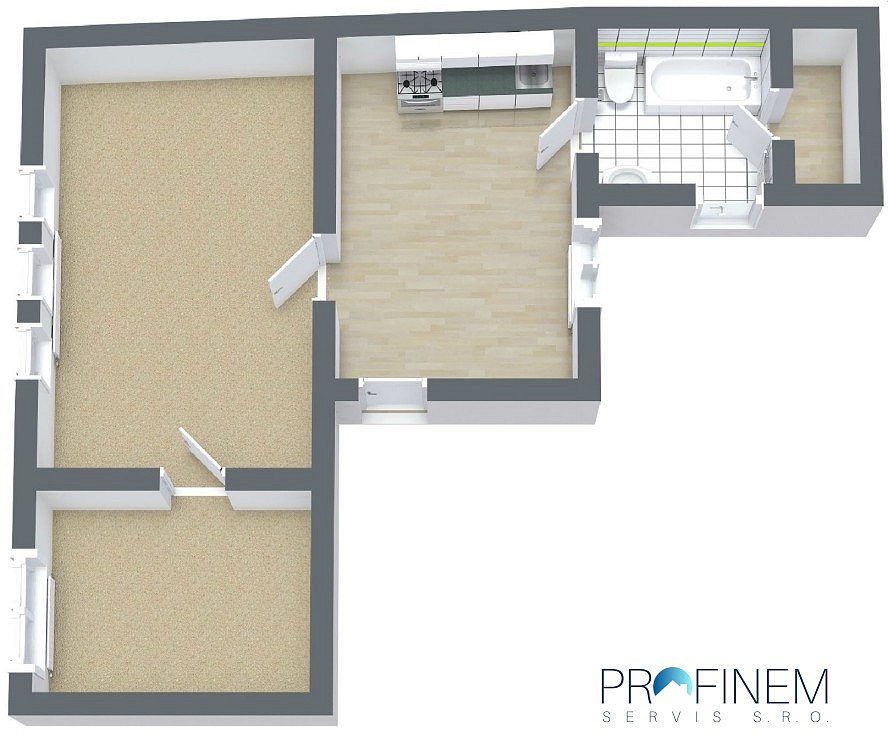 Dispozice bytu sestává z kuchyně s kuchyňskou linkou a plynovým sporákem, obývací pokoj, ložnice, koupelna s WC, komora.