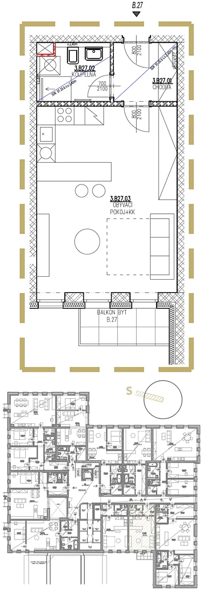 Nabízíme k prodeji byt B27 o dispozici 1+kk a celkové výměře 36,2 m² dle NOZ (čistá užitná plocha 35,6 m²). Byt se nachází ve 3. podlaží a je orientován převážně na západ. K bytu náleží balkon o výměře 3 m² a sklepní kóje o velikosti 2,5 m². Cena zahrnuje i parkovací stání – vše je uvedeno včetně DPH.
